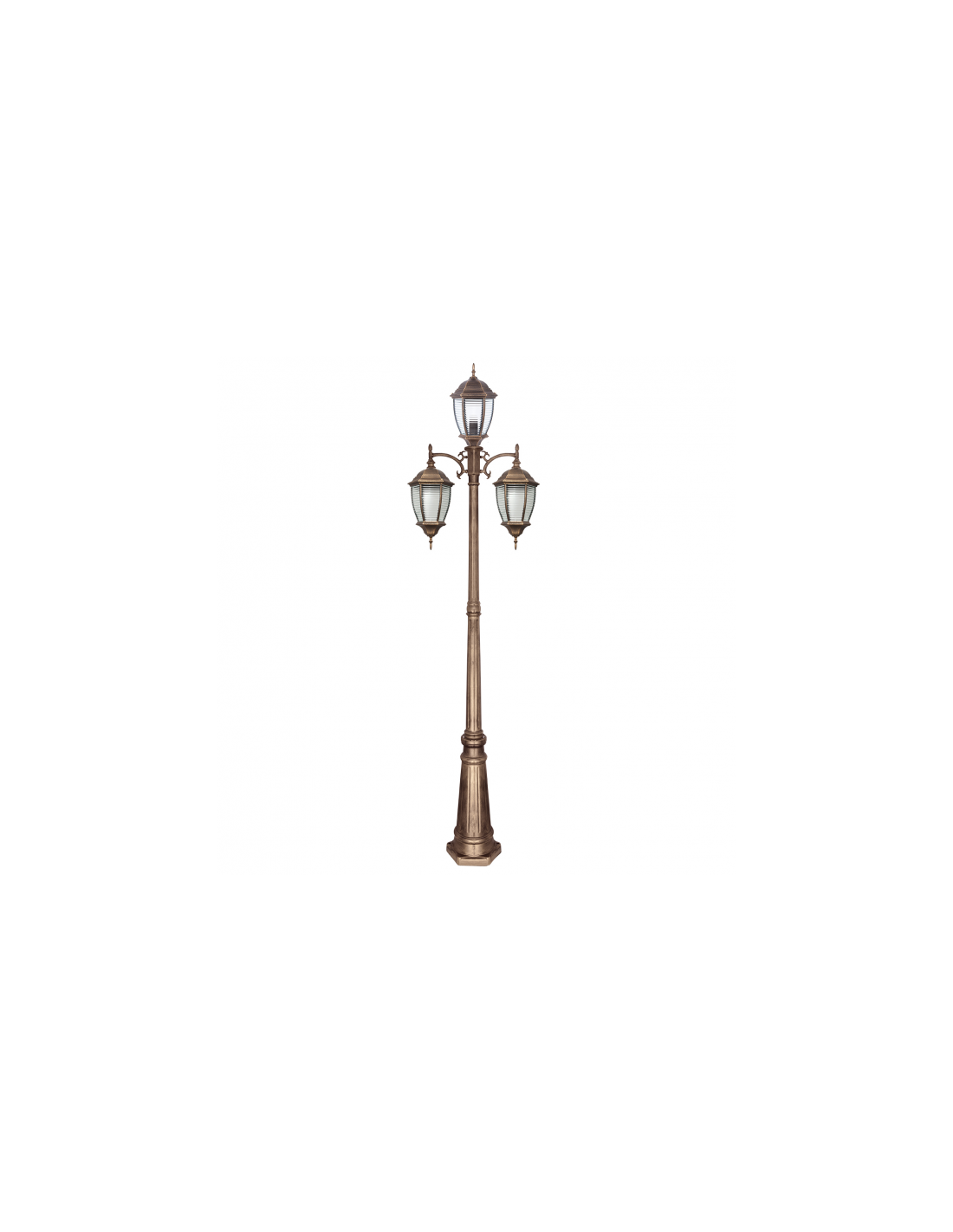 Farola exterior TOMILLO realizada en metal y cristal, en color bronce/oro y tres portalámparas E27. Tiene unas medidas de 233X55X24 centímetros.