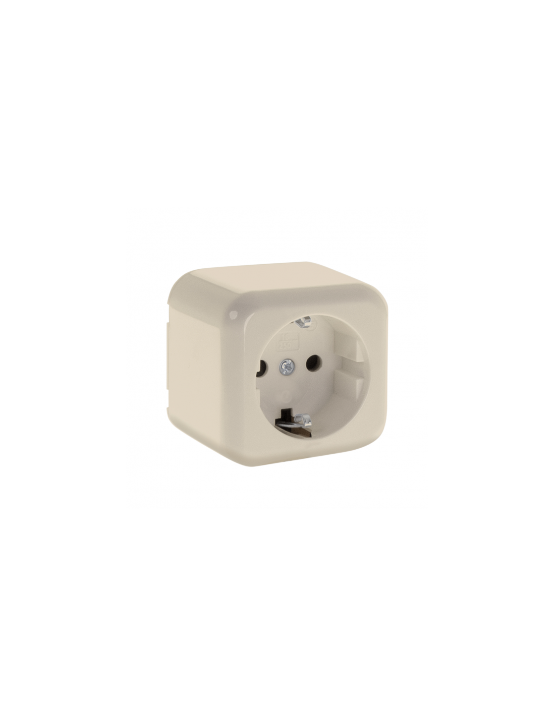 Base de enchufe serie ANCIENT simple con dos tomas de tierra y en color beis. Sus dimensiones son 6x6x4,5 cm. Realizado en policarbonato.