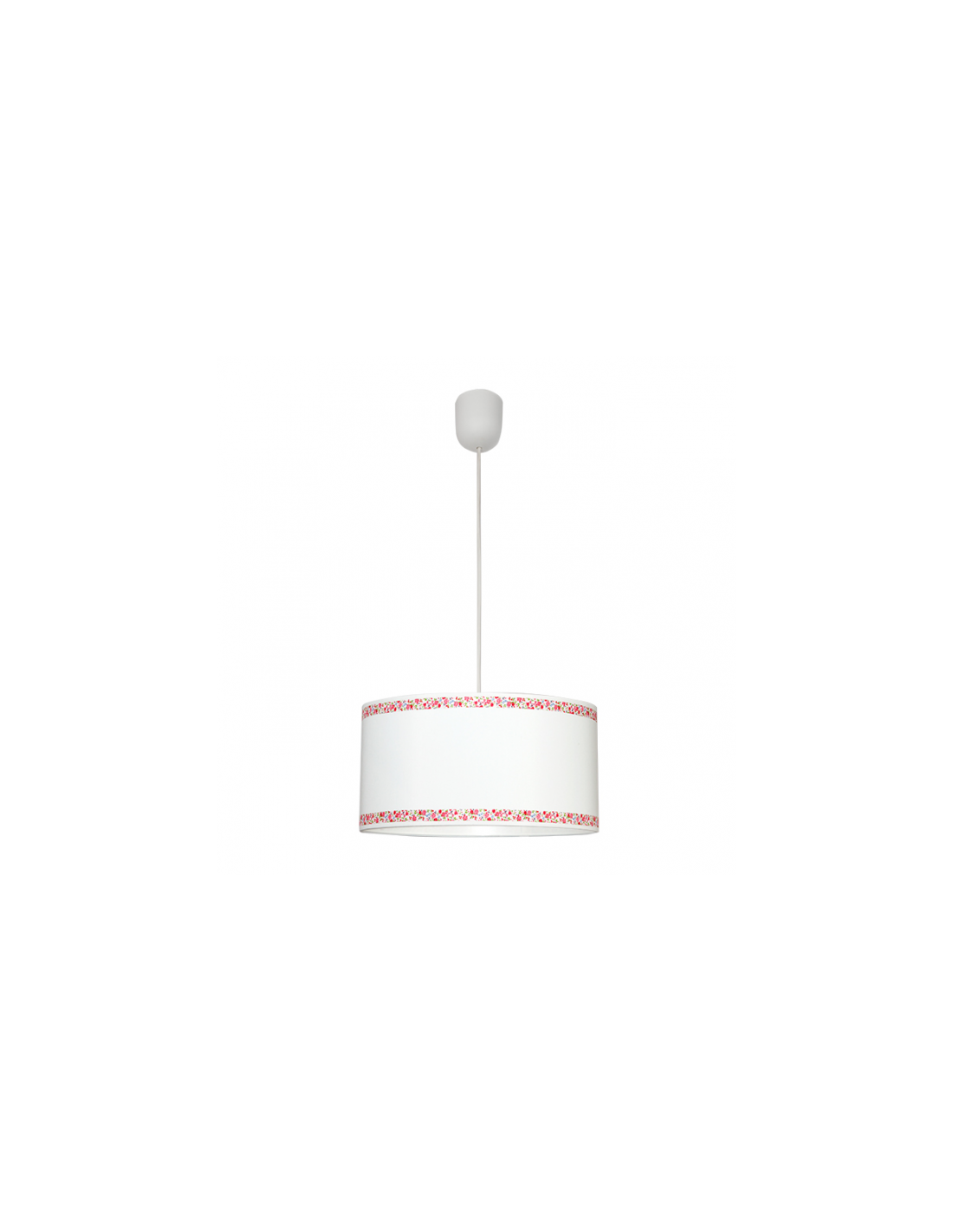 Colgante serie CENEFA de color Blanco con detalles en rosa. Tiene un diámetro de 35 cm y una altura regulable. La pantalla se caracteriza por dos cenefas decorativos con motivos florales en tonos rosas y verdes. Portalámparas E27.