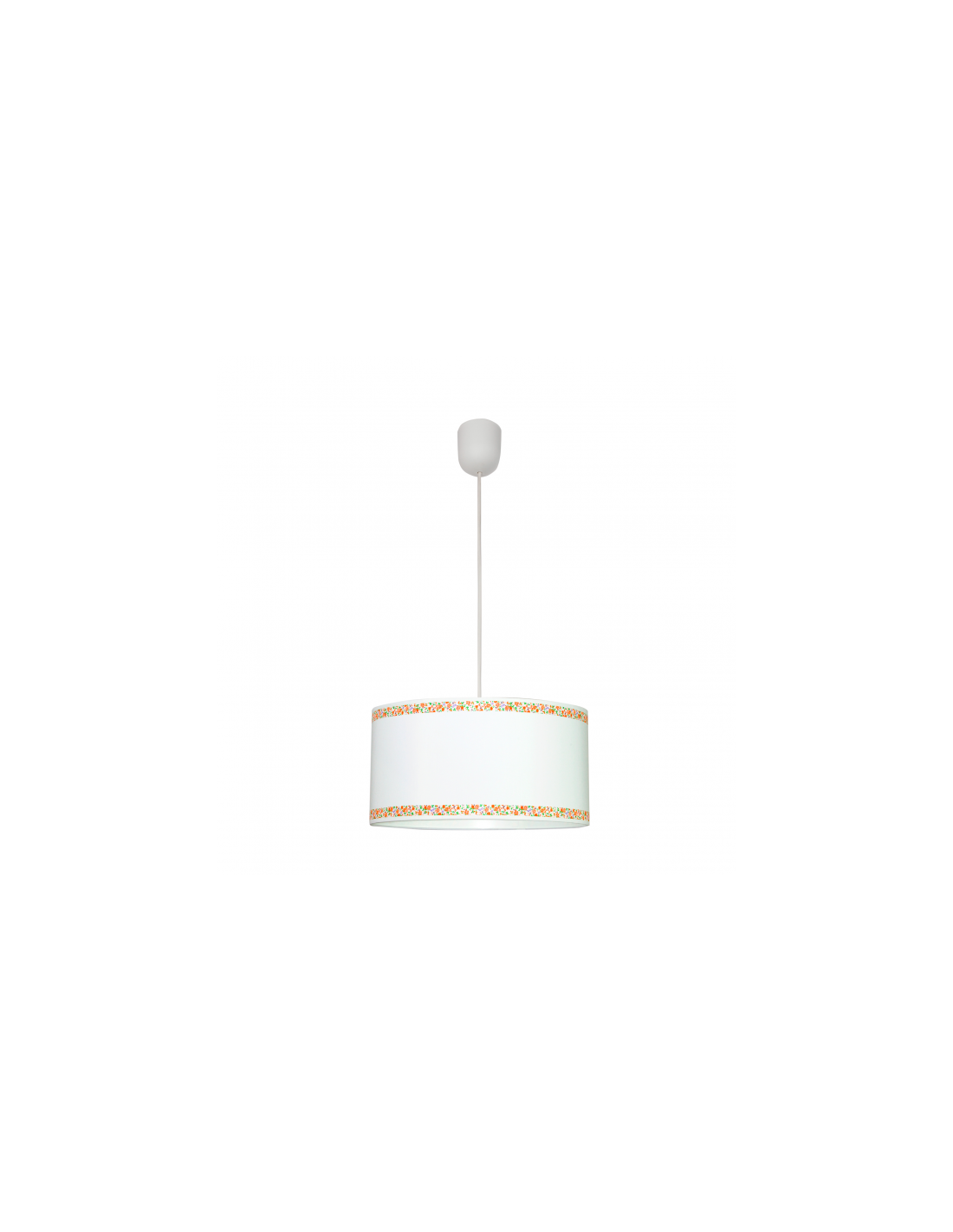 Colgante serie CENEFA de color blanco con detalles en naranja. Tiene un diámetro de 35 cm y una altura regulable. La pantalla se caracteriza por dos cenefas decorativos con motivos florales en tonos naranjas, verdes y azules. Portalámparas E27.