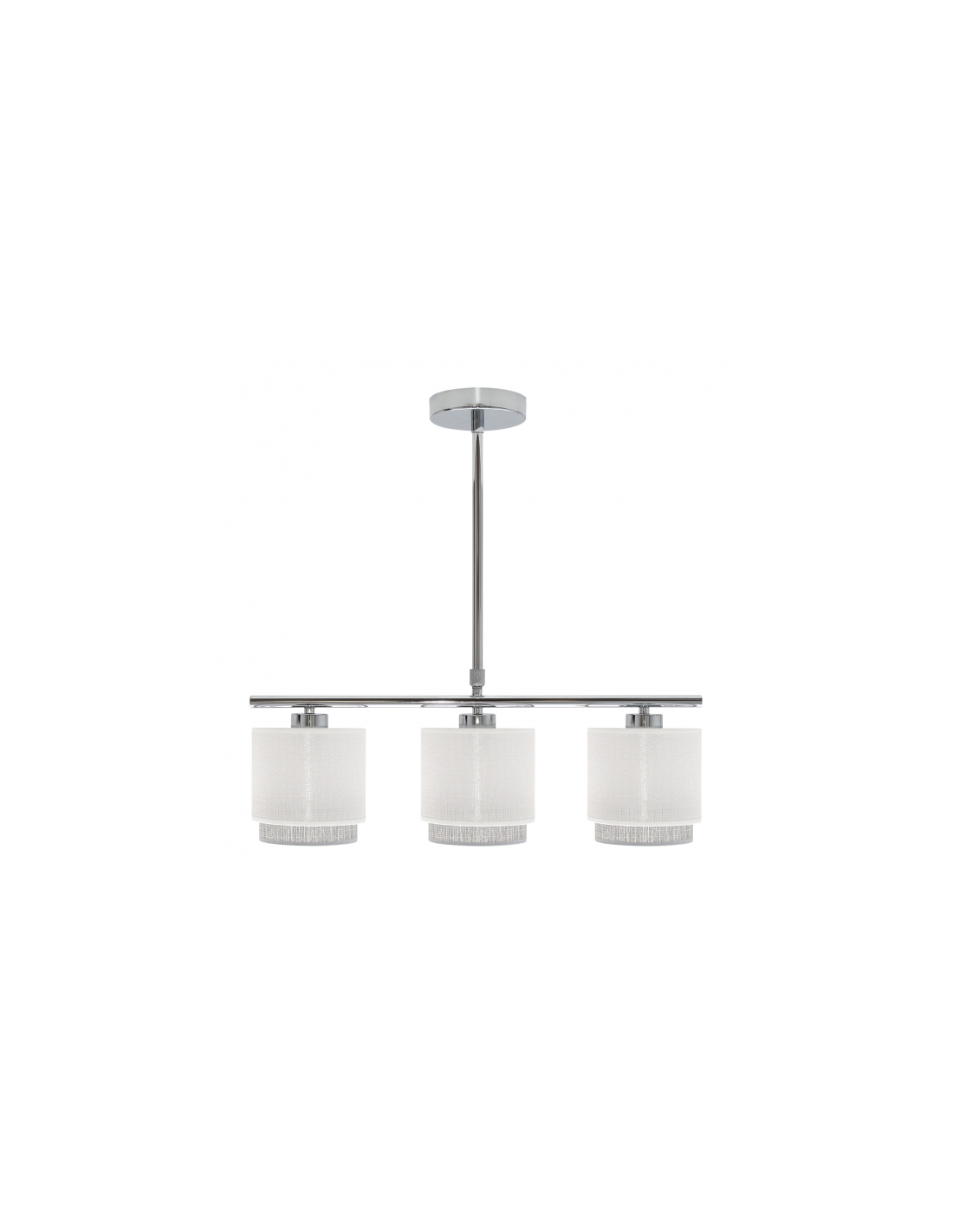 Lámpara de tres luces de la serie KENYA en color BLANCO/GRIS. Posee tres porta lámparas E14. Bombillas no incluidas. Tiene unas dimensiones, regulables en altura, de 56<,85x56x14 centímetros. Puede combinarlo con el colgante de 40 cm, colgante de 50 cm, lámpara de dos y cuatro luces, el sobremesa y el pie de salón, tanto en la combinación gris/blanco como en blanco/gris.