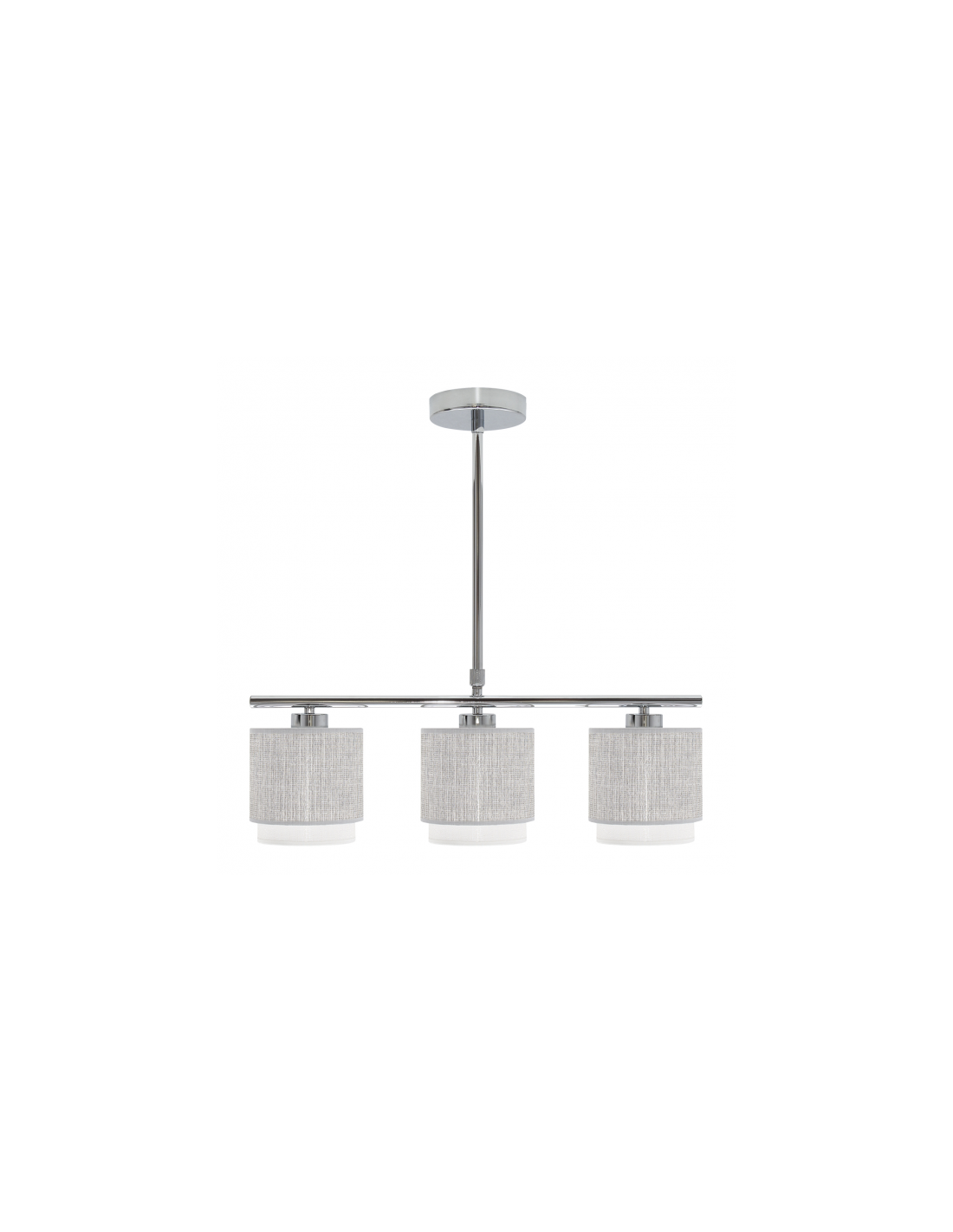 Lámpara de tres luces de la serie KENYA en color GRIS/BLANCO. Posee tres porta lámparas E14. Bombillas no incluidas. Tiene unas dimensiones, regulables en altura, de 56<,85x56x14 centímetros. Puede combinarlo con el colgante de 40 cm, colgante de 50 cm, lámpara de dos y cuatro luces, el sobremesa y el pie de salón, tanto en la combinación gris/blanco como en blanco/gris.