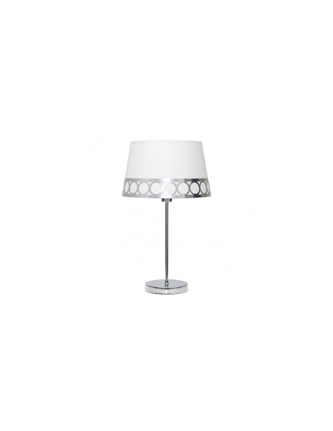 Sobremesa de la serie DALIA de color BLANCO/PLATA. Está realizado en metal y material textil, con cenefa decorativa de motivos circulares. Posee un porta lámparas E14. Bombilla no incluida. Tiene unas dimensiones de 44x25x25 centímetros. La familia se puede completar con el sobremesa, pie de salón y lámpara de tres y dos luces. Disponible todas las versiones en color blanco/plata, blanco/oro y beis/marrón.