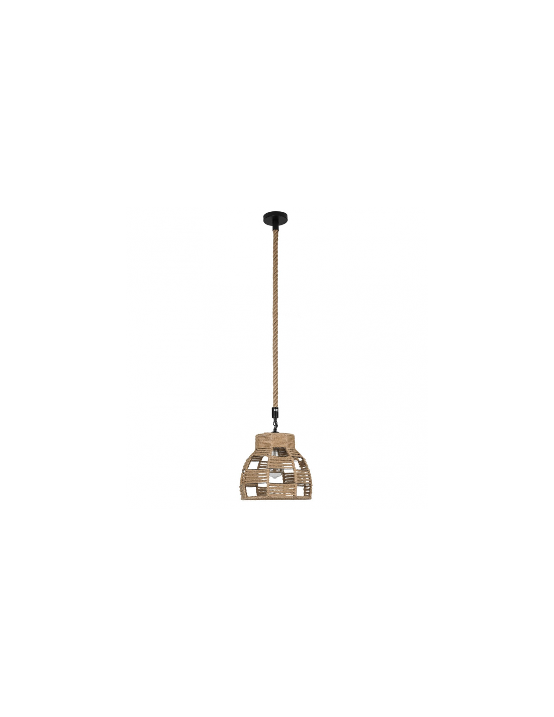 Colgante serie Yute realizado en cuerda. Esta familia se compone de un armazón de metal en el que se entrelazan gruesos hilos de cuerda. El resultado es un juego de formas muy original. Es ideal para estancias decoradas en el nuevo estilo vintage rústico. Sus dimensiones son 34<,116X27X27 cm con altura regulable. El portalámparas es E27. Bombilla no incluida. Varios diseños y tamaños disponibles en esta misma serie.