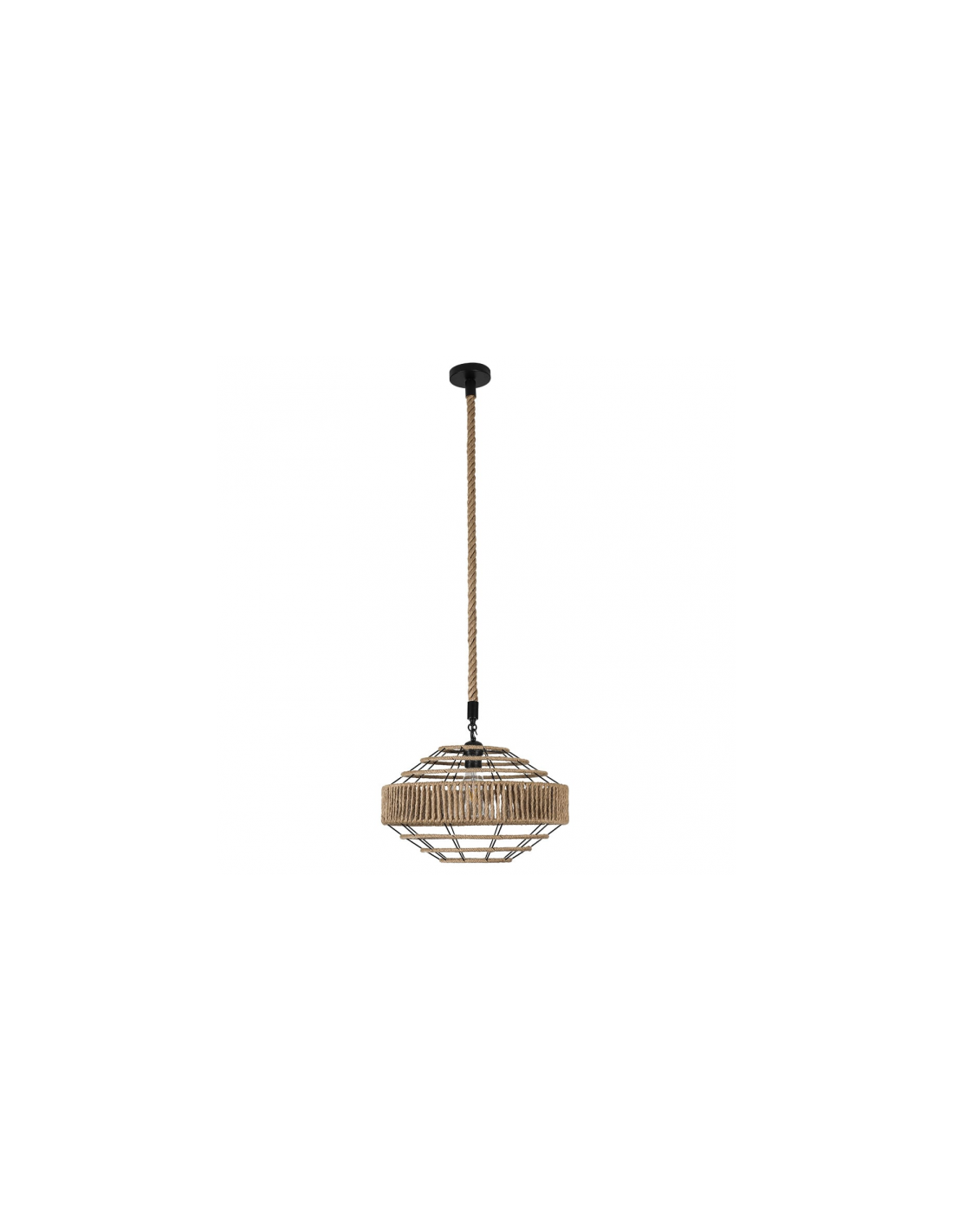 Colgante serie Yute realizado en cuerda y metal. Se compone de un armazón de metal en el que se entrelazan gruesos hilos de cuerda. Este diseño se compone de dos formas cónicas truncadas e invertidas que dejan pasar la luz. Es ideal para estancias decoradas en el nuevo estilo vintage rústico. Sus dimensiones son 45<,114x40x40 centímetros con altura regulable. Posee un portalámparas E27. Disponible varios diseños y tamaños de esta misma serie, todos combinando cuerda y metal.