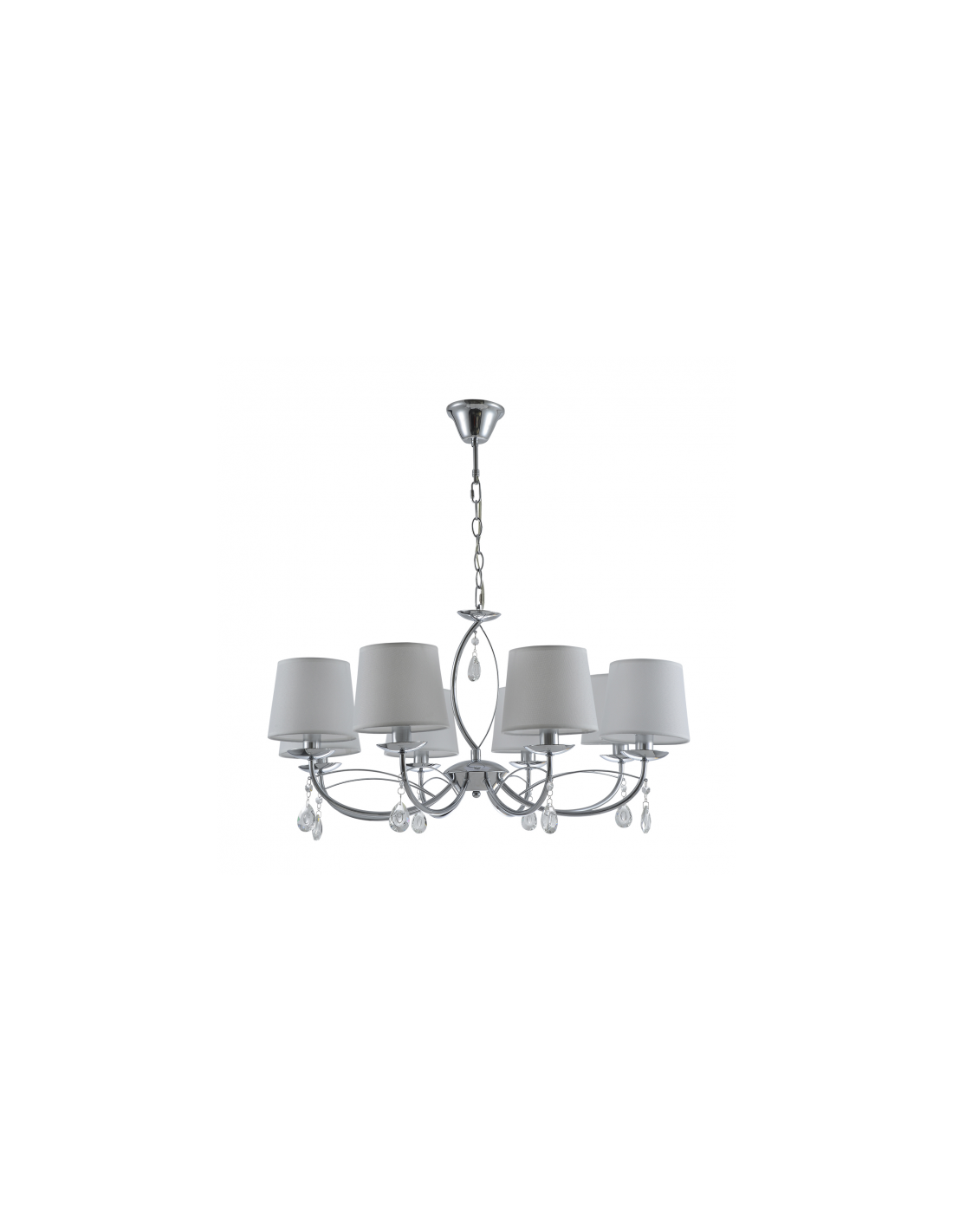 Lámpara de ocho luces serie Monterrey en color cromo. Esta realizada en metal, cristal y material textil de color blanco. Posee un cuerpo en forma de ojal del que pende un pequeño colgante de cristal, al igual que en cada uno de sus brazos. Sus dimensiones son 65<,90x19x67x67 cm (altura regulable). Está disponible también en color cuero/pantalla beis. La familia se completa con el sobremesa, pie de salón y lámpara de cinco y tres luces. El portalámparas es E14.