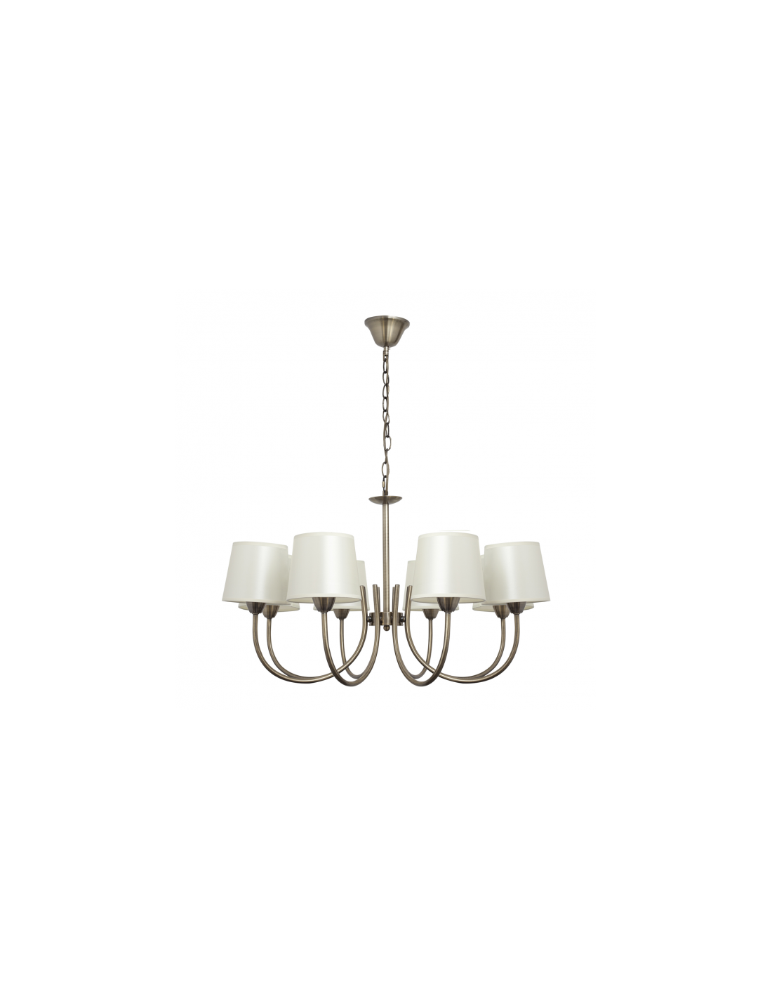 Lámpara serie Guadalajara de color cuero/beis. Está realizada en metal y textil. Está disponible también el sobremesa, aplique, lámpara de cinco luces y tres luces en color cromo, cuero y blanco. Sus dimensiones son 62<,92x72x72 cm con altura regulable. Su peso neto es de 2640 g. Posee ocho portalámparas E14.