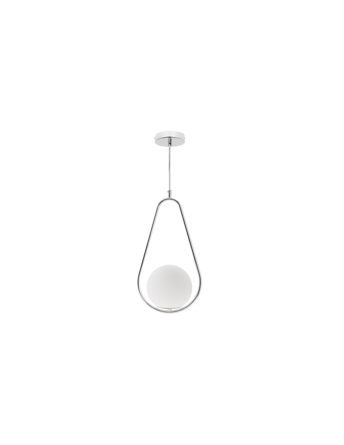 Colgante serie Aimee de color cromo. Este original colgante está formado por un cuerpo de metal en forma de pera sobre la cual descansa una esfera de cristal de color blanco. Forma parte de una familia completa donde puede combinar distintos modelos de colgantes, además del sobremesa y el aplique a juego. Sus dimensiones, regulables en altura son de 43<,121x21,5x15 centímetros. El peso neto 1190 g y el portalámparas E27.