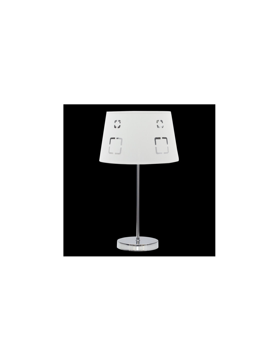 Sobremesa serie Celaya de color blanco. Realizado en metal color cromo y material textil. La pantalla presenta un diseño con formas geométricas caladas que dejan pasar la luz. Sus dimensiones son 43x25x25 cm. Está disponible el colgante y pie de salón en color blanco y varios colores. El portalámparas es E14.