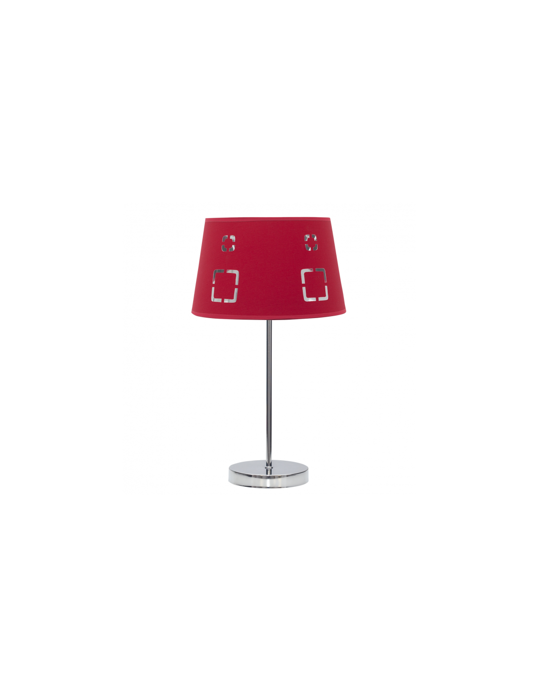 Sobremesa serie Celaya de color rojo. Realizado en metal color cromo y material textil. La pantalla presenta un diseño con formas geométricas caladas que dejan pasar la luz. Sus dimensiones son 43x25x25 cm. Está disponible el colgante y pie de salón en color rojo y varios colores. El portalámparas es E14.