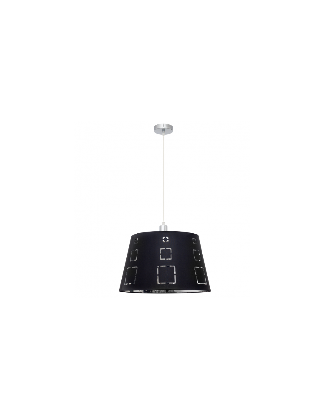 Colgante serie Celaya de color negro. Realizado en metal color cromo y material textil. La pantalla presenta un diseño con formas geométricas caladas que dejan pasar la luz. Sus dimensiones son 40<,110x40x40 cm con altura regulable. Está disponible en otros colores además del sobremesa y pie de salón. El portalámparas es E27.