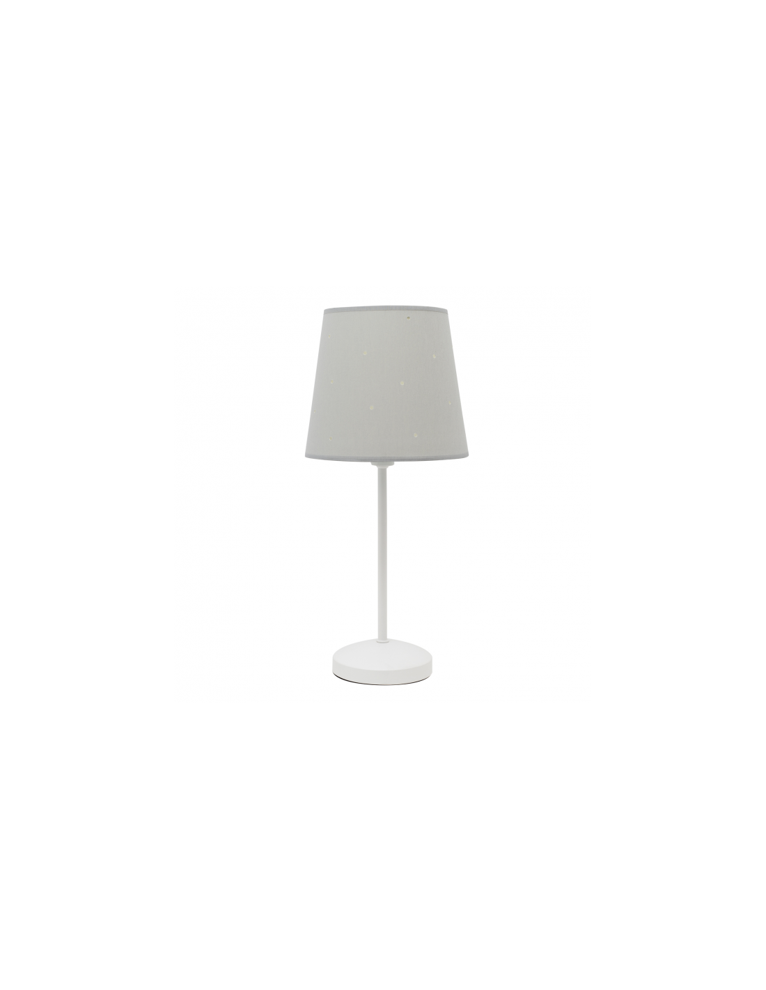Sobremesa de la serie CONSCIENCIA en color GRIS. Realizado en metal y material textil, es ideal para ambientes infantiles. El perforado de la pantalla crea un juego lumínico muy interesante. Sus dimensiones son 47x20x20 cm. Portalámparas E14. Disponible en varios colores. Puede completar la serie con el colgante y lámpara de dos luces, también en otros colores.