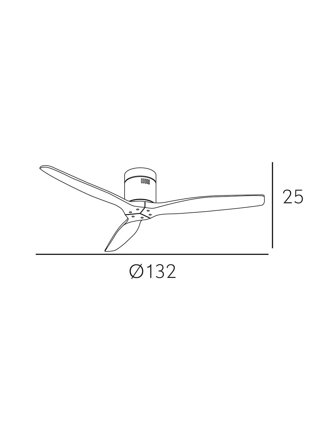 Ventilador AGUILON sin luz incorporada, realizado en metal y madera, en color NIQUEL con tres aspas de color HAYA. Motor DC. Tiene cinco velocidades ajustables. Su medida es de 25X132X132 centímetros. Control de aire verano o invierno. Mando a distancia INCLUIDO con TEMPORIZADOR 1/4/8 H. Modelo también disponible en Blanco, Marrón-Roble y en Cuero-Roble.