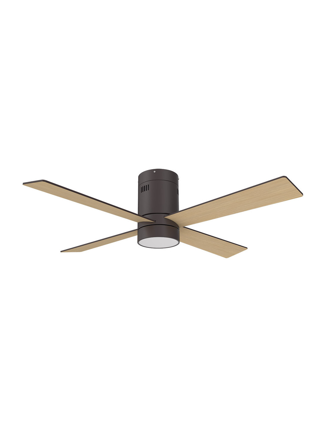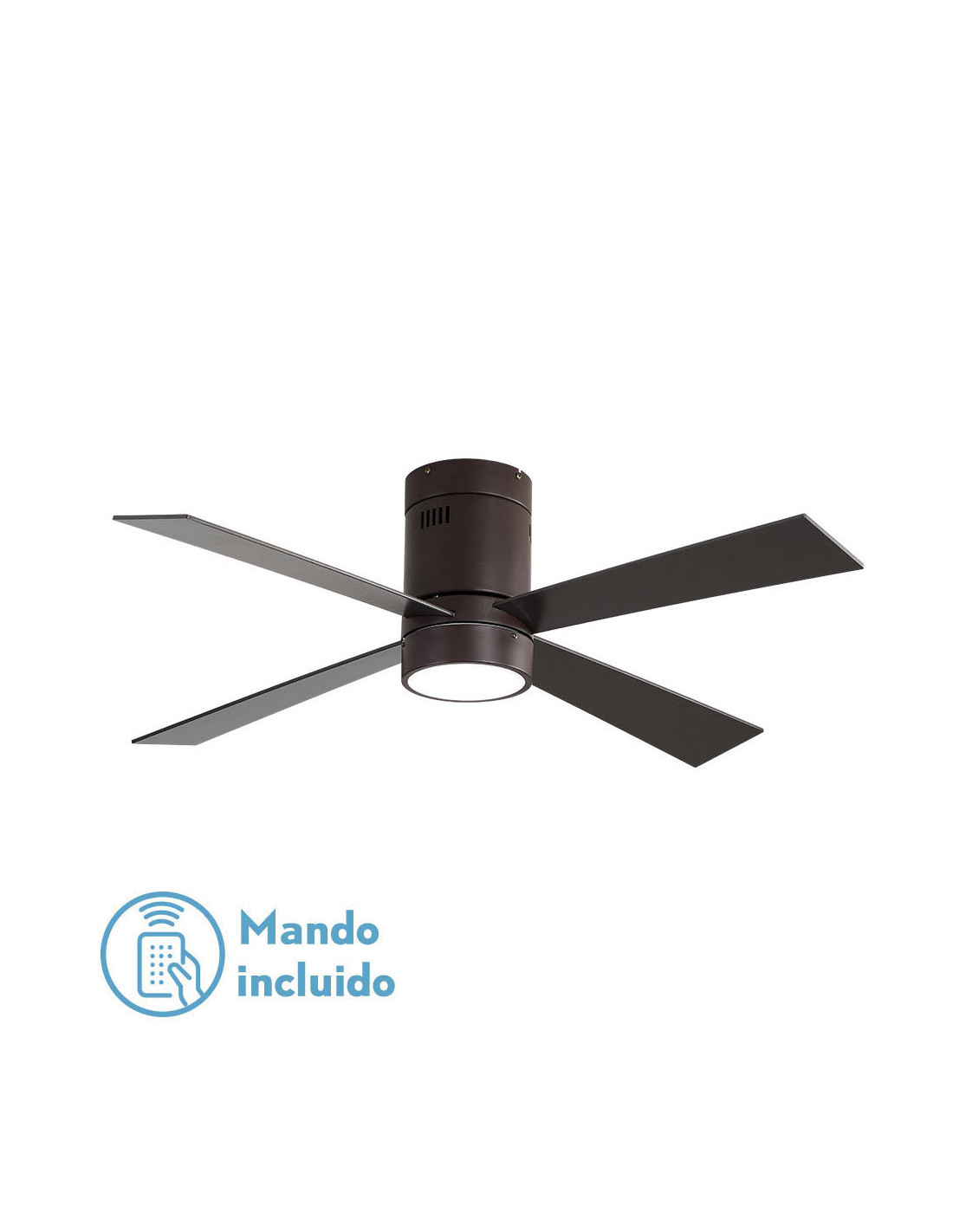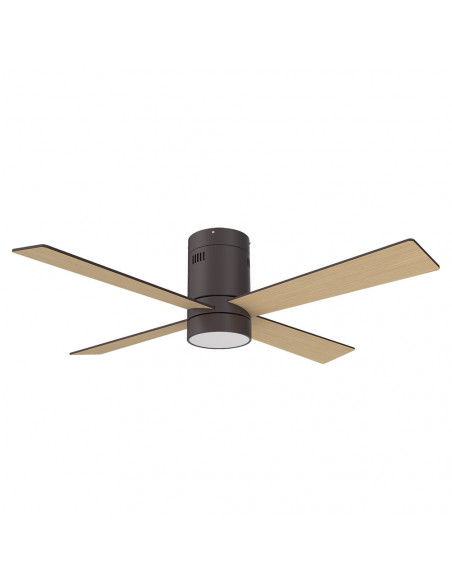 Ventilador BARINE realizado en metal, madera y policarbonato, en color MARRON con cuatro aspas REVERSIBLES de color HAYA/MARRON. Tiene tres velocidades ajustables. Tecnología LED incorporada con una potencia de 18W, con 3 TEMPERATURAS DE LUZ( 3000-4000-6000K) y 2350 lúmenes. Su medida es de 30X122X122 centímetros. Control de aire sólo verano. Mando a distancia INCLUIDO con MEMORIA DE COLOR incorporada y TEMPORIZADOR 1/2/4/8 H. Modelo también disponible en Blanco-Blanco/Haya, Cuero-Roble/Cerezo y Níquel-Haya/Plata.