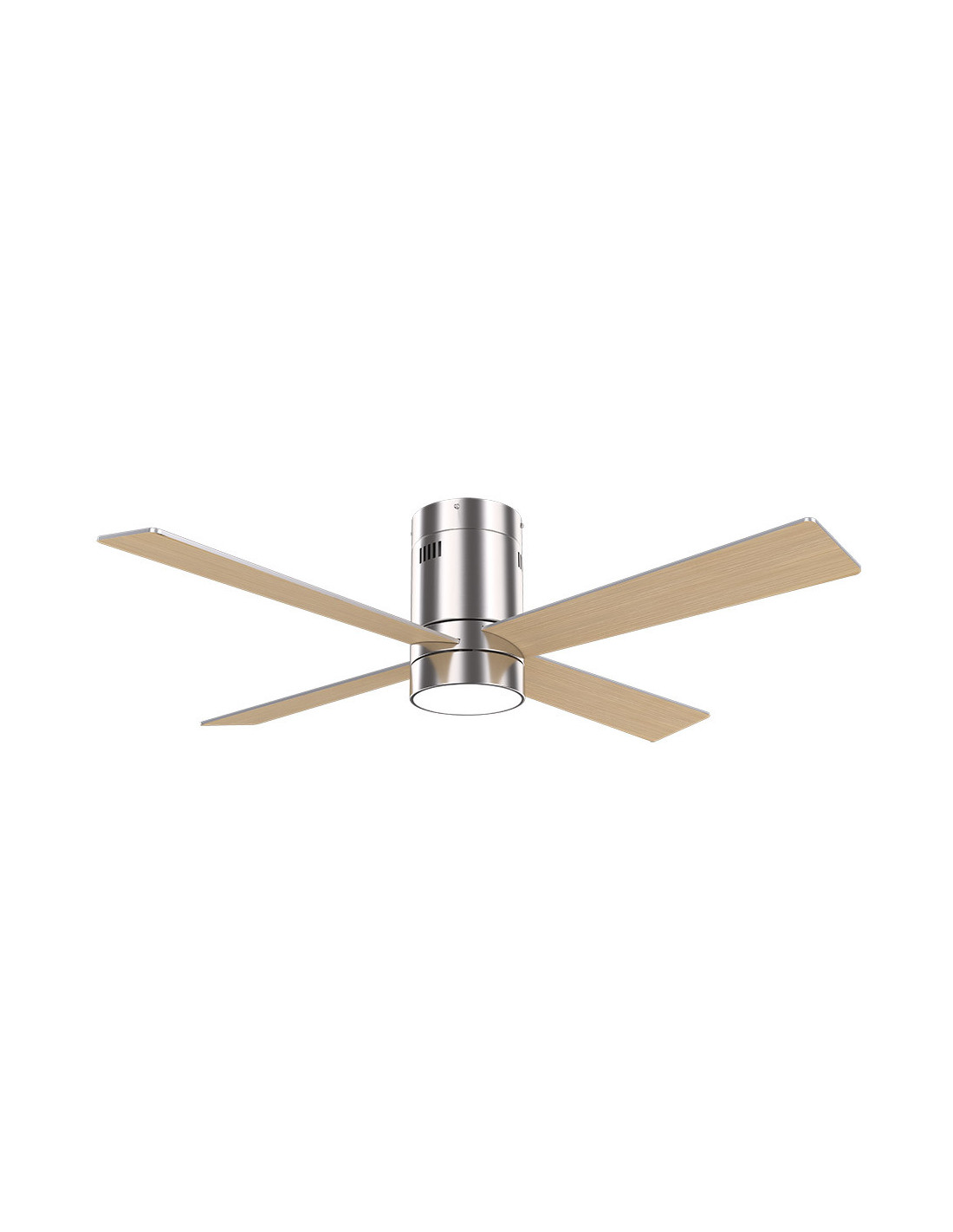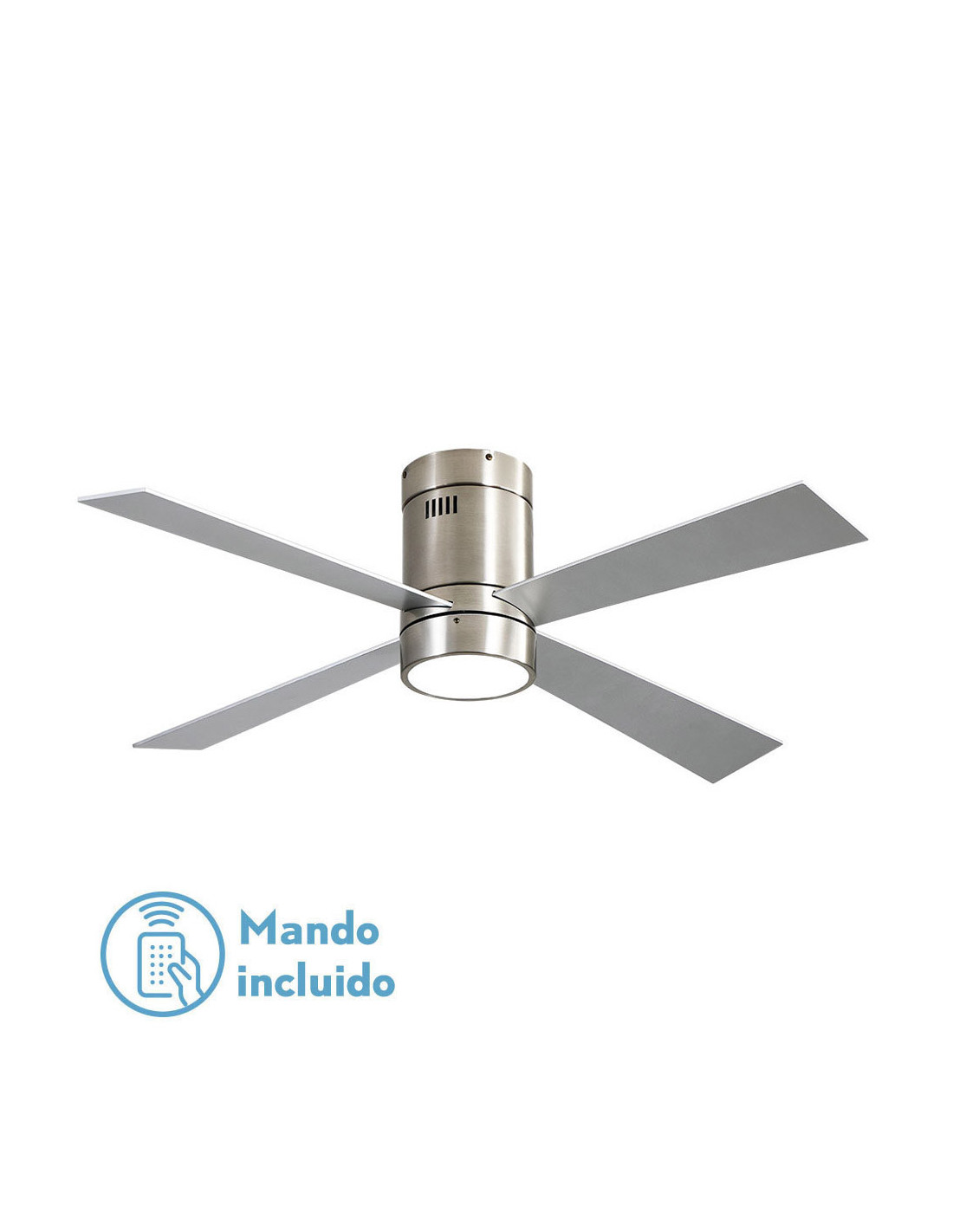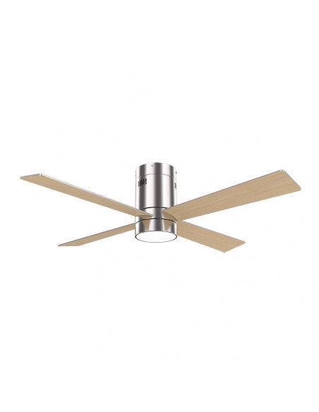 Ventilador BARINE realizado en metal, madera y policarbonato, en color NIQUEL con cuatro aspas REVERSIBLES de color HAYA/PLATA. Tiene tres velocidades ajustables. Tecnología LED incorporada con una potencia de 18W, con 3 TEMPERATURAS DE LUZ( 3000-4000-6000K) y 2350 lúmenes. Su medida es de 30X122X122 centímetros. Control de aire sólo verano. Mando a distancia INCLUIDO con MEMORIA DE COLOR incorporada y TEMPORIZADOR 1/2/4/8 H. Modelo también disponible en Marrón-Haya/Marrón, Cuero-Roble/Cerezo y Blanco-Blanco/Haya.