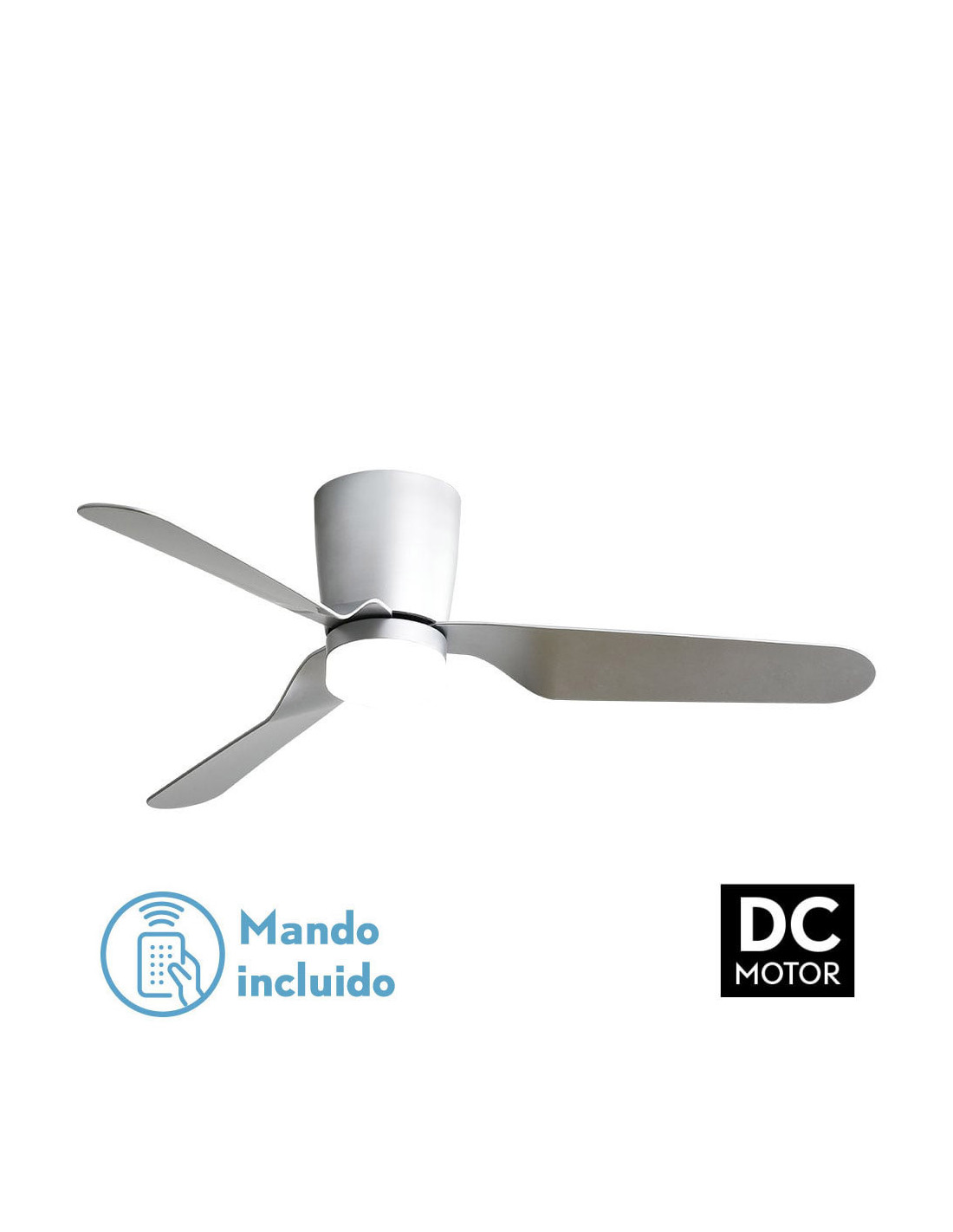 Ventilador KOCHI realizado en metal, MDF y policarbonato, en color NIQUEL con tres aspas de color PLATA. Motor DC. Tiene cinco velocidades ajustables. Tecnología LED incorporada con una potencia de 18W, con 3 TEMPERATURAS DE LUZ (3000-4000-6000K) y 2350 lúmenes. Su medida es de 27X132X132 centímetros. Control de aire verano o invierno. Mando a distancia INCLUIDO con MEMORIA DE COLOR incorporada y TEMPORIZADOR 1/4/8 H. Modelo también disponible en Marrón y en Blanco.