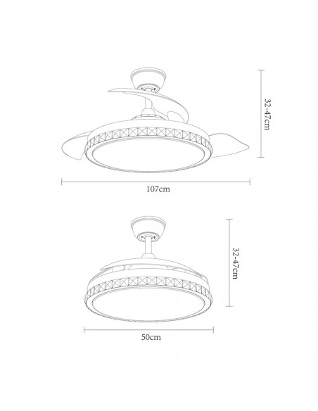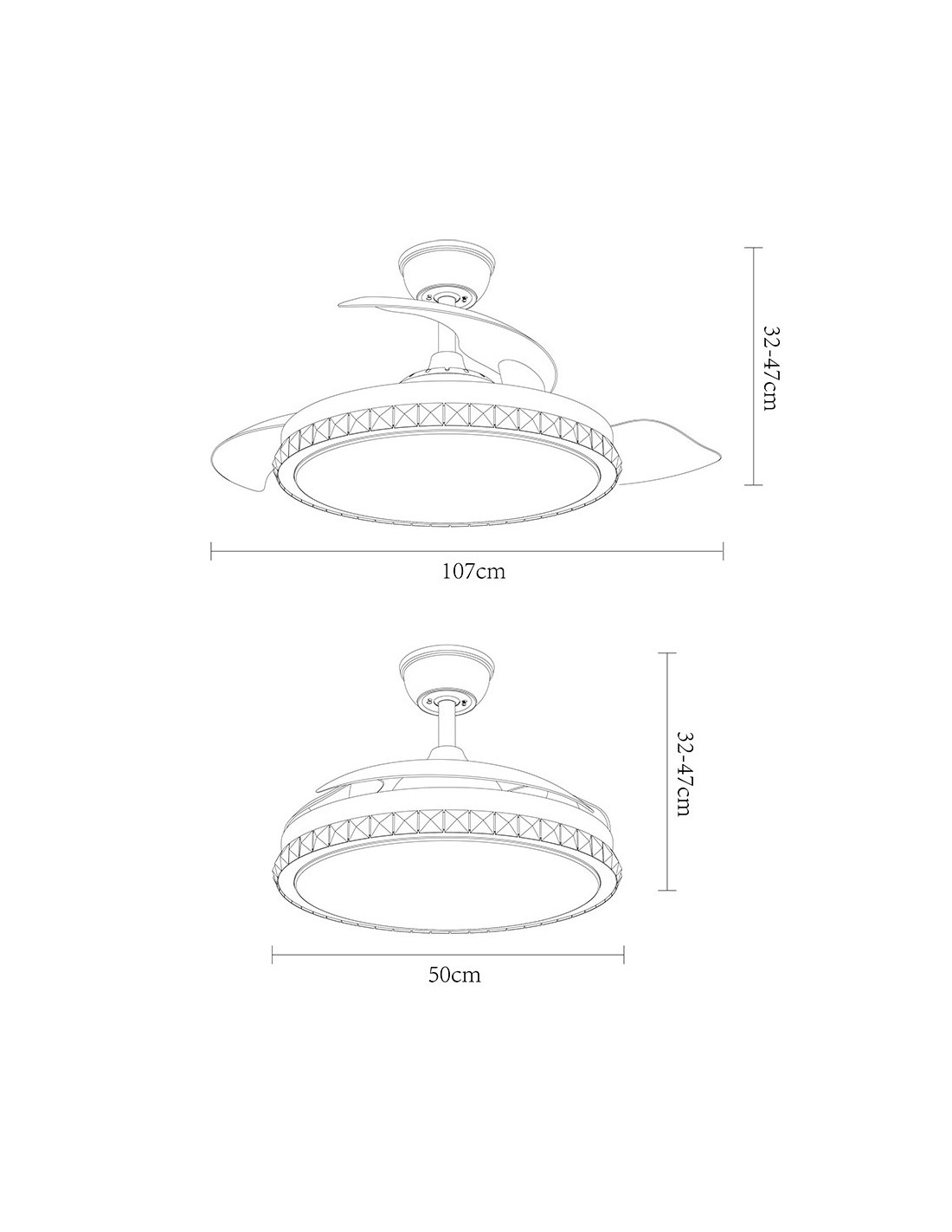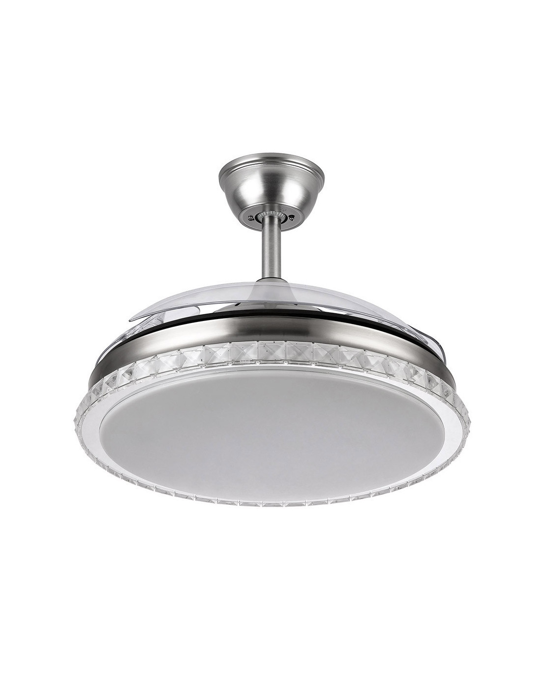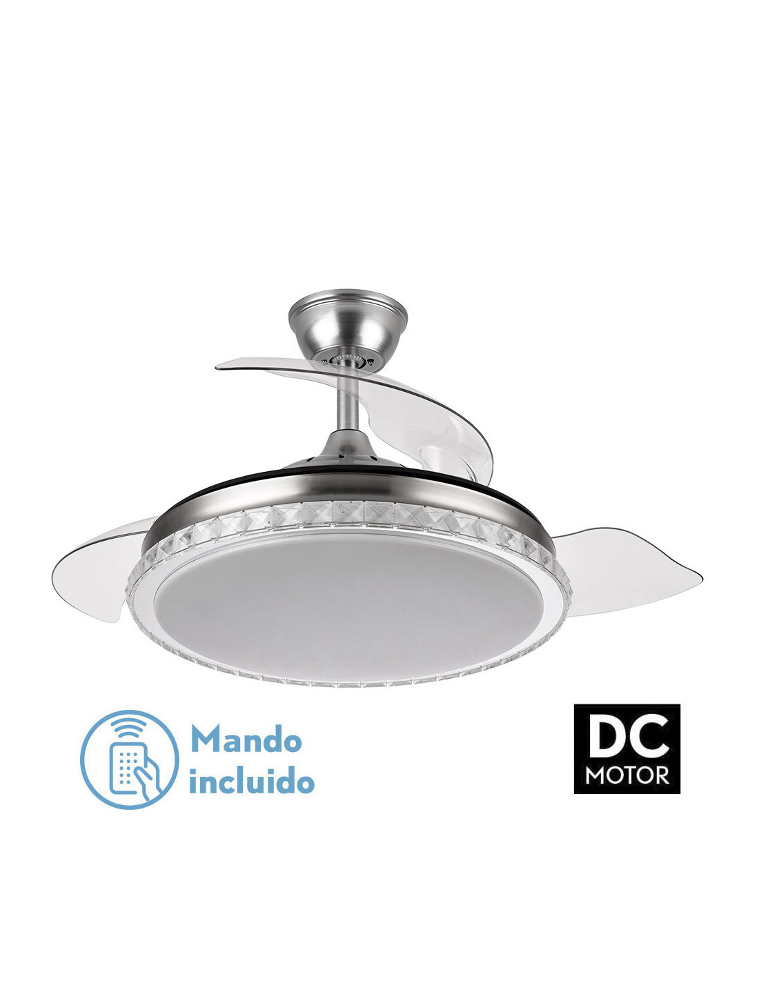 Ventilador DC serie BILIKU realizado en metal, policarbonato y metacrilato, en color NÍQUEL con tres aspas DESPLEGABLES transparentes de metacrilato muy resistentes. Tiene seis velocidades ajustables. Tecnología LED integrada con una potencia de 72W, con 3 TEMPERATURAS DE LUZ (3000-4000-6000K) y 6117 lúmenes. Control de aire verano o invierno. Su medida es de 32/47X50 centímetros con las aspas plegadas y de 32/47X108 centímetros con las aspas desplegadas. Incluye dos tijas de 10 y 25 centímetros. Mando a distancia INCLUIDO con MEMORIA DE COLOR incorporada y TEMPORIZADOR 1/2/4 H.