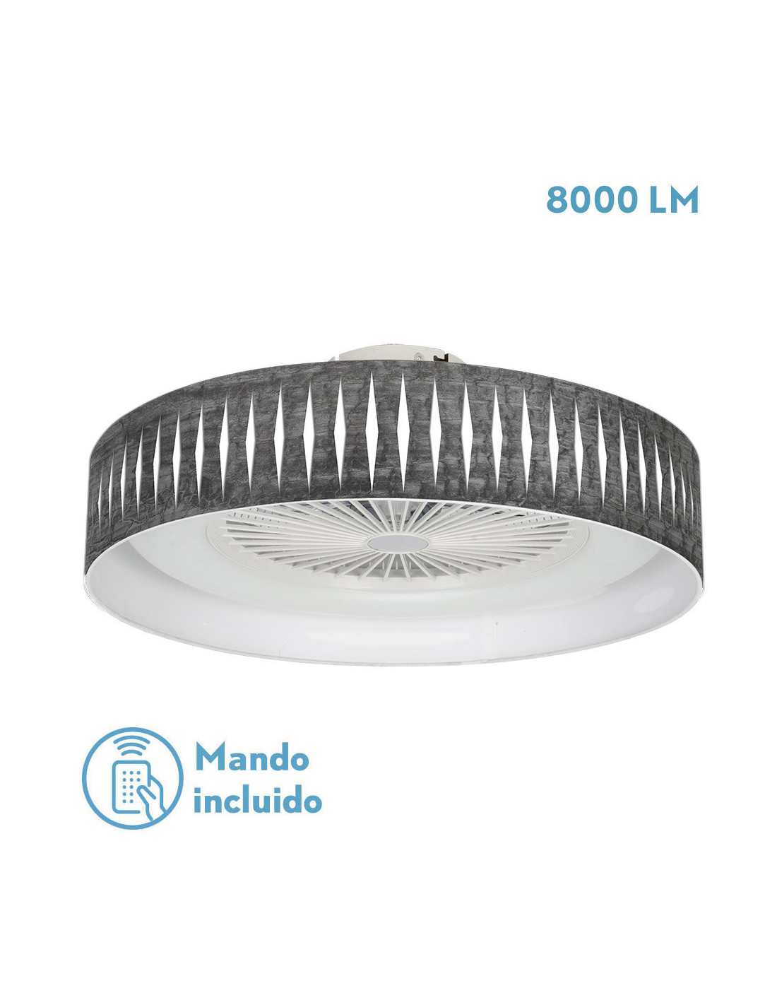 Ventilador serie PIRON de color BLANCO. Con ventilador de la serie PERI. Realizado en metal, policarbonato y una pantalla de textil de color MADERA NEGRA. Diseño moderno, con 5 aspas integradas en su estructura y 3 velocidades ajustables. Posee TECNOLOGÍA LED INTEGRADA con 72 watios de potencia, 8000 lúmenes, 3 temperaturas de luz y REGULABLE EN INTENSIDAD, cálida, natural y blanco frío (3000ºk-4000ºk-6000ºk). Sus dimensiones son de 23x57,5x57,5 centímetros. Incluye MANDO A DISTANCIA, CON MEMORIA DE COLOR y TEMPORIZADOR 1/2 H. Muy decorativo y original, pudiéndose también combinar en dormitorios y salones con el sobremesa y el Pie de salón a juego de esta misma serie.Modelo también disponible en color blanco/madera clara, blanco/óxido, blanco/madera gris, blanco/madera oscura y blanco/cemento gris.