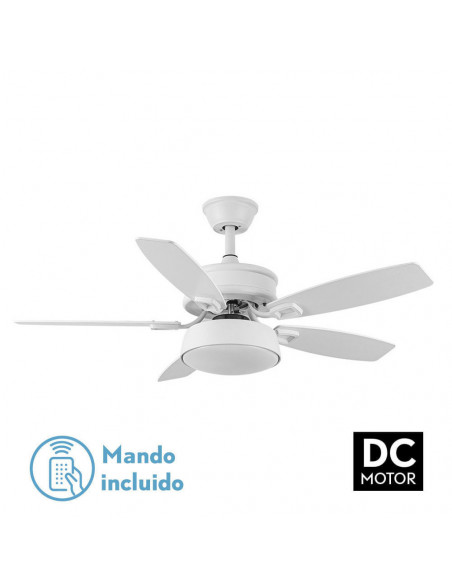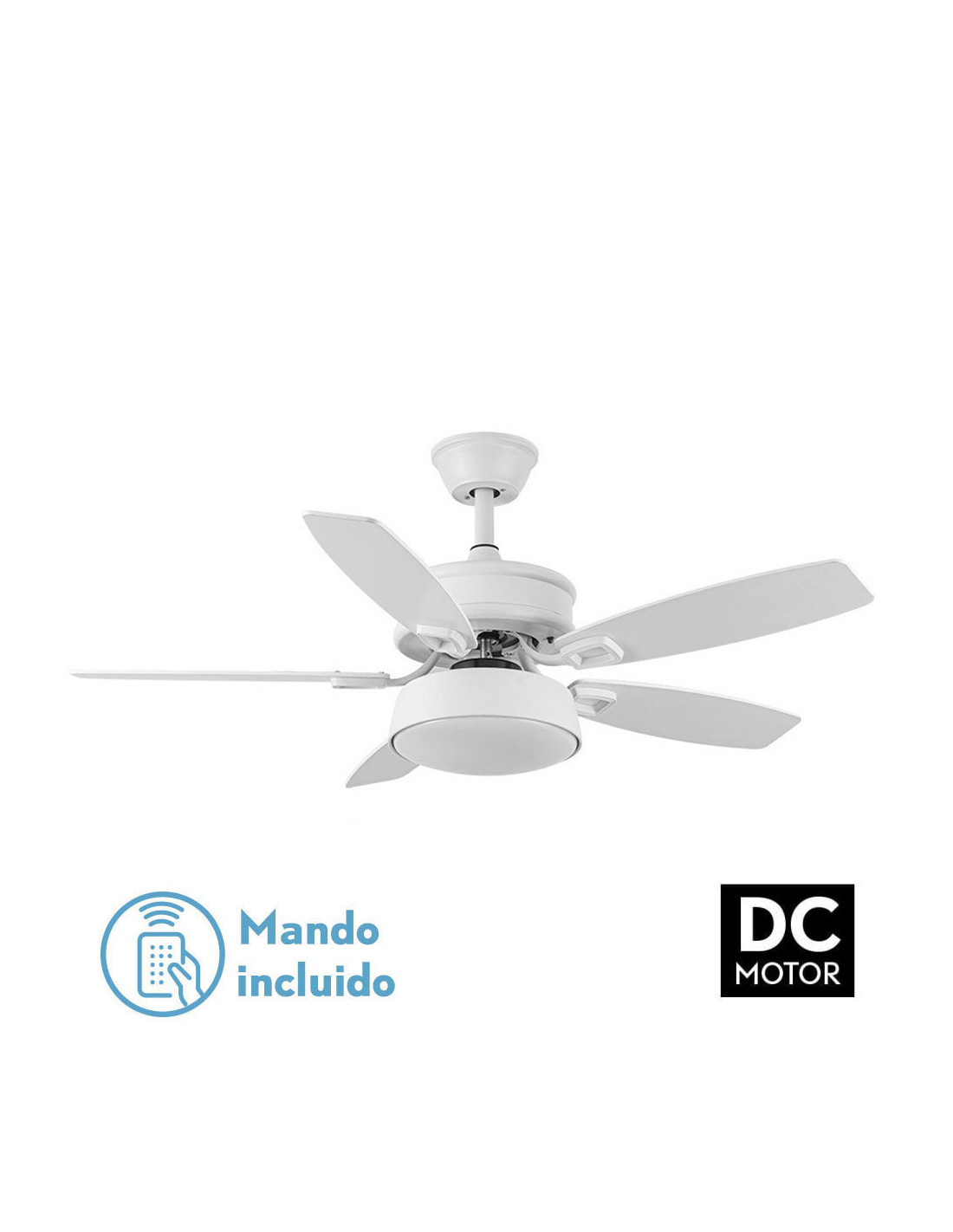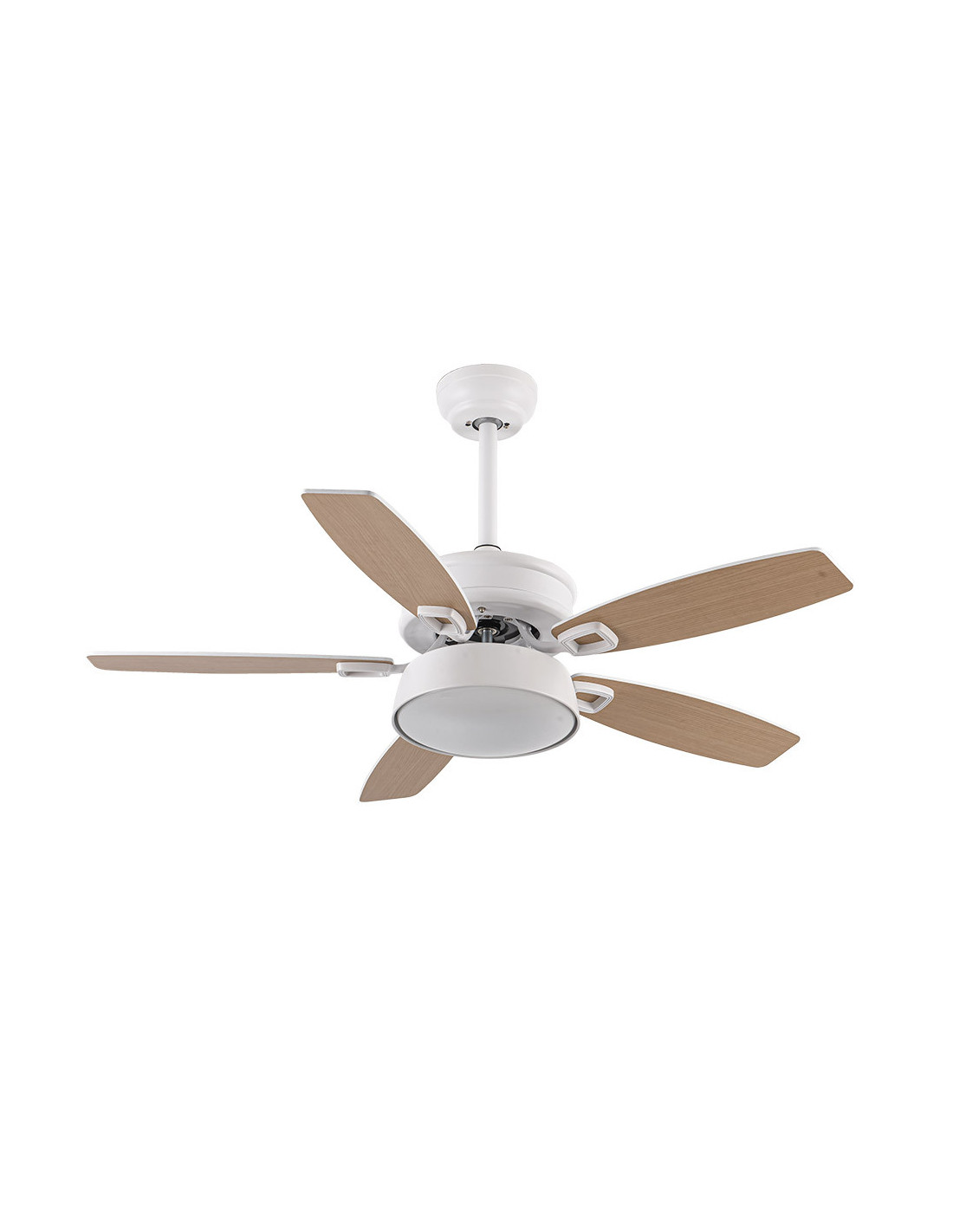 Ventilador DC de la serie BRAW de color BLANCO con 5 aspas reversibles color BLANCO/HAYA. Realizado de metal, MDF y tulipa de cristal. Tiene una medida de 46/56,2x106,7x106,7 centímetros. Tecnología LED integrada con una potencia de 30W, con COLOR DE LUZ SELECCIONABLE EN 3 TEMPERATURAS (3000-4000-6000K) y 2850 lúmenes. Contiene control remoto con 6 velocidades diferentes, memoria de color, modo de verano/invierno y temporizador de 1 hasta 8 horas. Incluye dos tijas de 15 y 25 centímetros. Modelo disponible en los colores blanco-blanco/haya, cuero-roble/nogal y níquel-plata/haya, hasta agotar existencias.