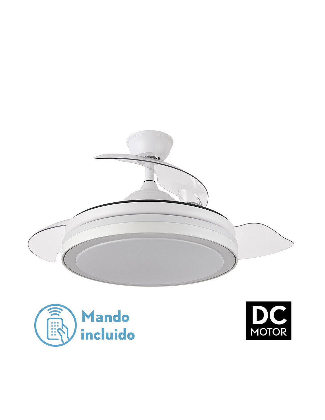 Ventilador DC de la serie ESPARTA realizado en metal, policarbonato y ABS, en color BLANCO con tres aspas DESPLEGABLES de ABS transparente muy resistentes. Tiene seis velocidades ajustables. Tecnología LED integrada con una potencia de 72W, con 3 TEMPERATURAS SELECCIONABLES DE LUZ (3000-4000-6000K) y 6120 lúmenes. Control de aire verano o invierno. Su medida es de 32/47X50 centímetros con las aspas plegadas y de 32/47X107 centímetros con las aspas desplegadas. Incluye dos tijas de 10 y 25 centímetros, para colocar a distintas alturas. Mando a distancia INCLUIDO con MEMORIA DE COLOR incorporada y TEMPORIZADOR 1/2/4 H. Modelo también disponible con 48 watios de potencia y un diámetro de 91 centímetros.
