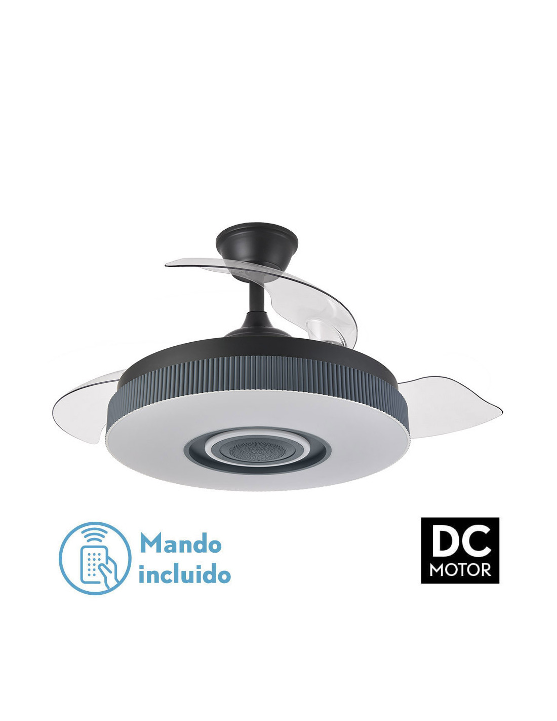 Ventilador DC de la serie PENICHE realizado en metal, policarbonato y ABS, en color NEGRO/GRIS con tres aspas DESPLEGABLES de ABS transparente muy resistentes. De diseño muy moderno, equipado con ALTAVOZ y RECEPCIÓN BLUETOOTH. Tiene seis velocidades ajustables. Tecnología LED integrada con una potencia de 72W, con 3 TEMPERATURAS DE LUZ (3000-4000-6000K) y 6120 lúmenes. Control de aire verano o invierno. Su medida es de 32/47X50 centímetros con las aspas plegadas y de 32/47X107 centímetros con las aspas desplegadas. Incluye dos tijas de 10 y 25 centímetros, para colocar a distintas alturas. Mando a distancia INCLUIDO con MEMORIA DE COLOR incorporada y TEMPORIZADOR 1/2/4 H.