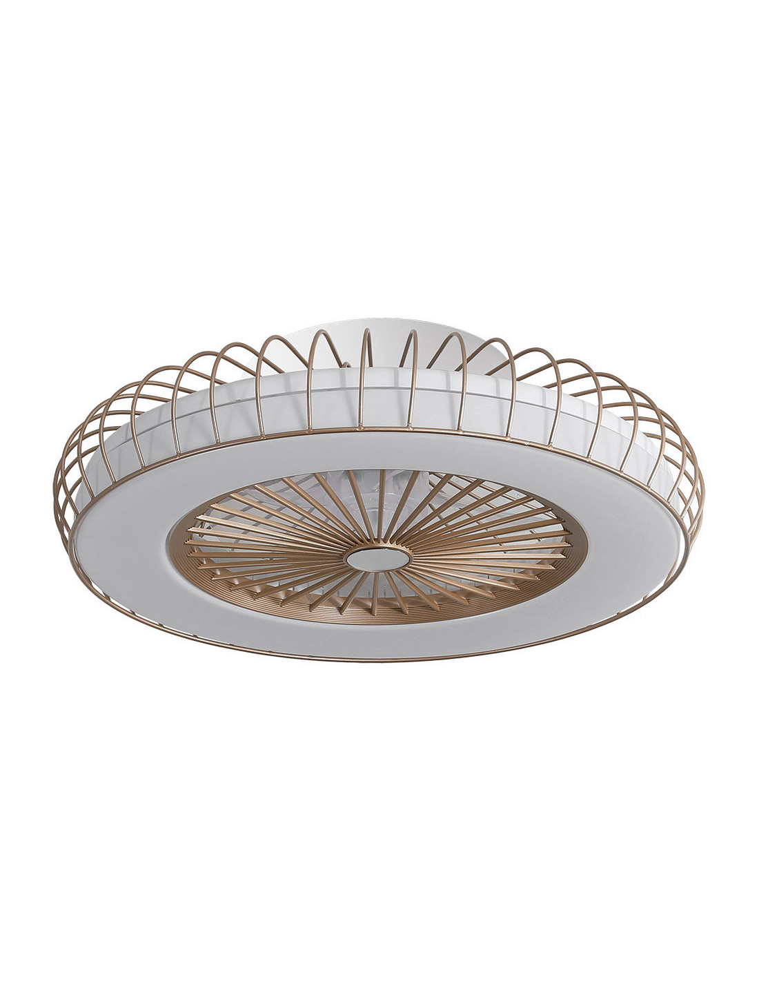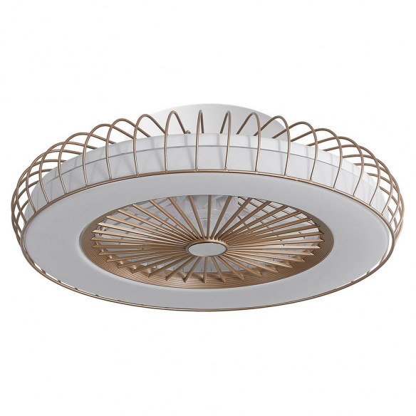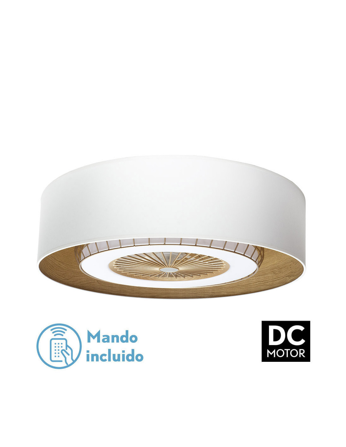 Ventilador DC de la serie TANIA con pantalla de color BLANCO y MADERA CLARA en el interior de su pantalla y ventilador dorado de la serie ALBONEZ. De diseño exclusivo y original, se hace el centro de la habitación que ilumina. Con 5 aspas integradas en su estructura y 6 velocidades ajustables. Motor DC. Posee TECNOLOGÍA LED INTEGRADA con 72 watios de potencia, 6120 lúmenes y TRES TEMPERATURAS DE LUZ, cálida, natural y blanco frío (3000ºk-4000ºk-6000ºk) con REGULADOR DE INTENSIDAD. Además de aportar un gran ahorro de energía, incluye MANDO A DISTANCIA, CON MEMORIA DE COLOR y TEMPORIZADOR 1/2/4/8 H. Destaca su original pantalla cilíndrica que combina el blanco y el negro con colores madera siempre en el interior, resultando una combinación muy moderna y elegante, ideal para dormitorios, despachos, salones y salas de estar. Muy acorde tanto para decoraciones rústicas como modernas o vintage. Tiene unas dimensiones de 19x70x70 centímetros. En esta serie podemos encontrar dos ventiladores diferentes, los colgantes de 50, 40 y 30 centímetros de diámetro, dos tamaños diferentes de sobremesas, aplique, plafones de 48, 72 y 96 watios y el pie de salón, todos combinando con colores madera.