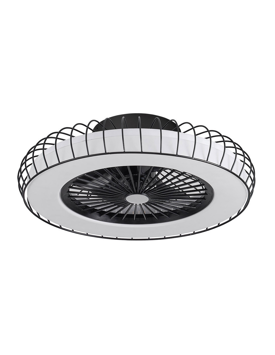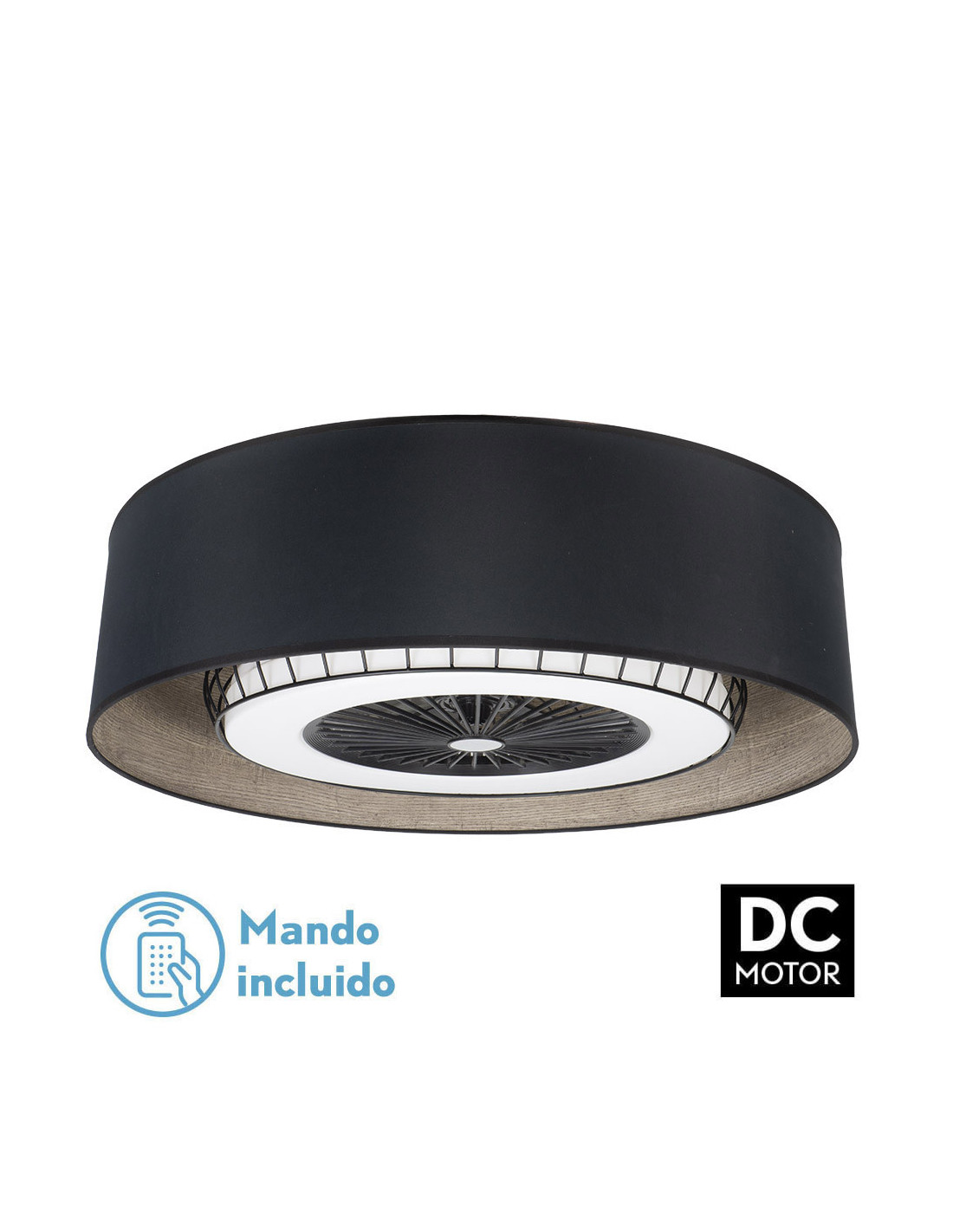 Ventilador DC de la serie TANIA con pantalla de color NEGRO y MADERA GRIS en el interior de su pantalla, con ventilador negro de la serie ALBONEZ. De diseño exclusivo y original, se hace el centro de la habitación que ilumina. Con 5 aspas integradas en su estructura y 6 velocidades ajustables. Motor DC. Posee TECNOLOGÍA LED INTEGRADA con 72 watios de potencia, 6120 lúmenes y TRES TEMPERATURAS DE LUZ, cálida, natural y blanco frío (3000ºk-4000ºk-6000ºk) con REGULADOR DE INTENSIDAD. Además de aportar un gran ahorro de energía, incluye MANDO A DISTANCIA, CON MEMORIA DE COLOR y TEMPORIZADOR 1/2/4/8 H. Destaca su original pantalla cilíndrica que combina el blanco y el negro con colores madera siempre en el interior, resultando una combinación muy moderna y elegante, ideal para dormitorios, despachos, salones y salas de estar. Muy acorde tanto para decoraciones rústicas como modernas o vintage. Tiene unas dimensiones de 19x70x70 centímetros. En esta serie podemos encontrar dos ventiladores diferentes, los colgantes de 50, 40 y 30 centímetros de diámetro, dos tamaños diferentes de sobremesas, aplique, plafones de 48, 72 y 96 watios y el pie de salón, todos combinando con colores madera.