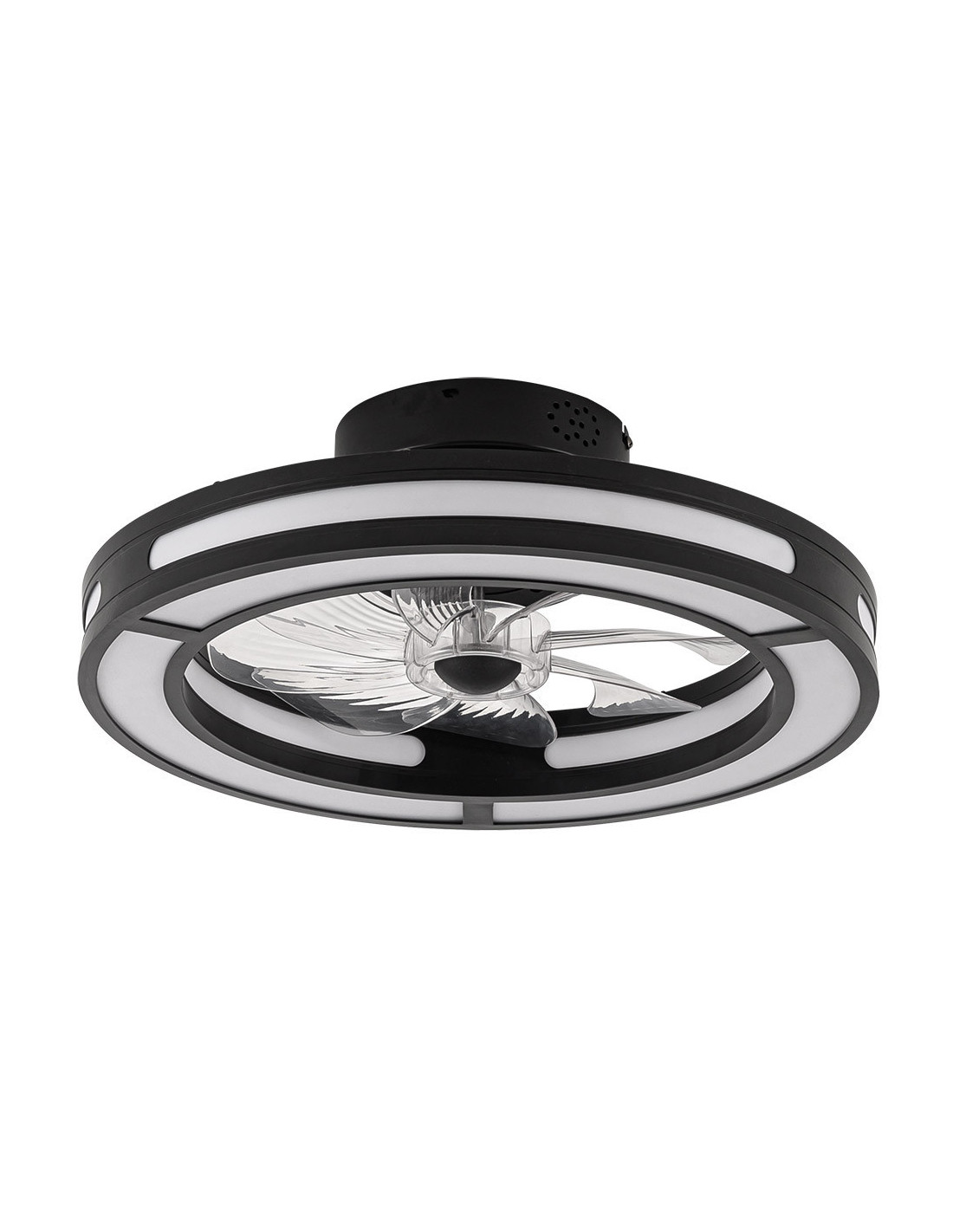 Ventilador DC de la serie ANASTASIA de color NEGRO con pantalla confeccionada con tejido perforado de color NEGRO/PLATA y ventilador de la serie KASTORIA. Realizado en metal, policarbonato y textil. Destaca su pantalla cilíndrica perforada con plata en su interior. Con ocho aspas en ABS transparentes y seis velocidades. Tecnología LED integrada con 58 watios de potencia, 5900 lúmenes y con 3 colores de luz (3000ºk-4000ºk-6000ºk), luz cálida, blanco natural y blanco frío. Incluye MANDO A DISTANCIA, con MEMORIA DE COLOR incorporada y TEMPORIZADOR 1/2/4 H. Estilo muy original y moderno, ideal para decorar, ventilar e iluminar en comedores, salones, despachos y dormitorios, aportando sofisticación a la estancia que iluminan. Apto para decoraciones Industriales, muy acorde también con estilos modernos que tienen la iluminación como elemento característico. Tiene unas dimensiones de 20x60x60 centímetros. En esta serie podemos encontrar los colgantes de 50, 40 y 30 centímetros de diámetro, dos tamaños diferentes de sobremesas, aplique, plafones de 48, 72 y 96 watios y el pie de salón, todos combinando el metal de sus armazones en negro con el textil perforado de sus pantallas negro/plata.