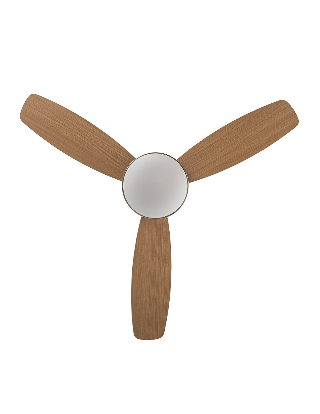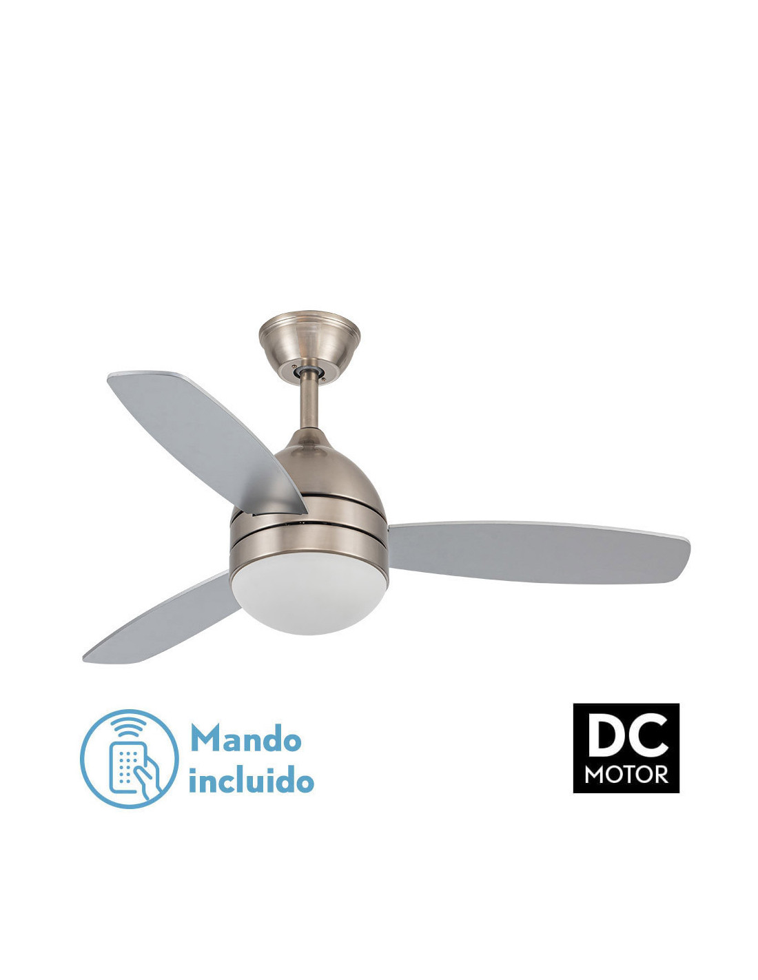 Ventilador DC de la serie MAESTRAL de color NIQUEL con 3 aspas reversibles de color PLATA/HAYA. Realizado de metal, ABS y tulipa de cristal. Tiene una medida de 47/57,2x106,7x106,7 centímetros. Tecnología LED integrada con una potencia de 30W, con COLOR DE LUZ SELECCIONABLE EN 3 TEMPERATURAS (3000-4000-6000K) y 2850 lúmenes. Contiene control remoto con 6 velocidades diferentes, memoria de color, modo de verano/invierno y temporizador de 1 hasta 8 horas. Incluye dos tijas de 15 y 25 centímetros. Modelo disponible en los colores blanco-blanco/haya, cuero-roble/nogal y níquel-plata/haya, hasta agotar existencias.