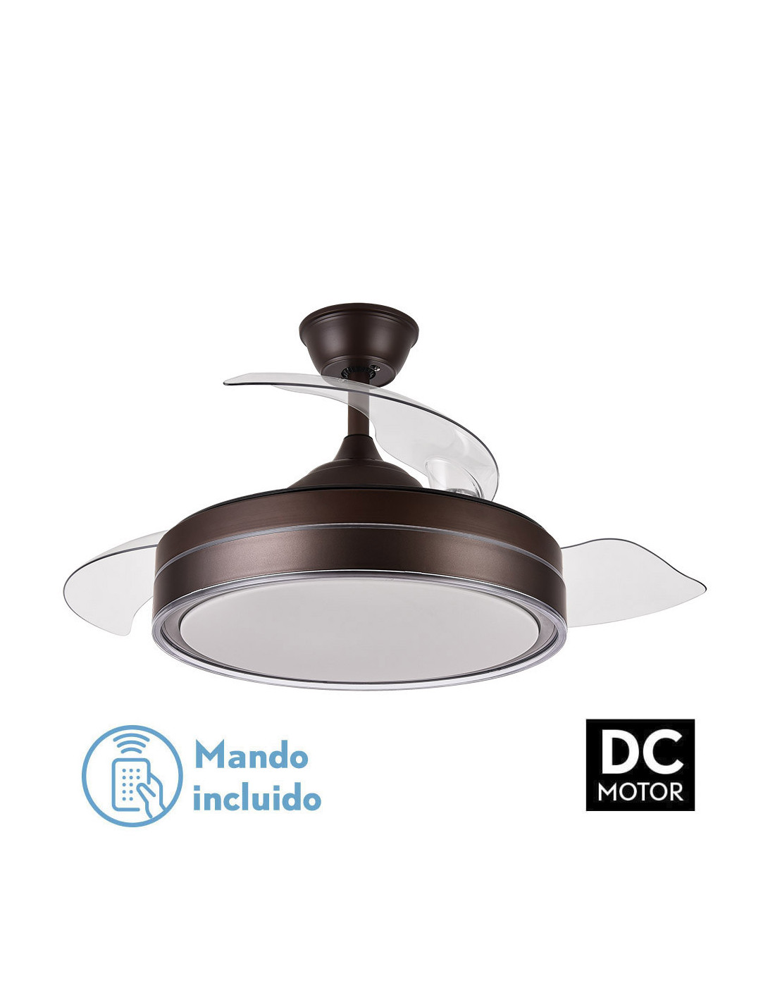 Ventilador DC serie CRIADOR realizado en metal, policarbonato y metacrilato, en color MARRÓN con tres aspas DESPLEGABLES de metacrilato transparente muy resistentes. Tiene seis velocidades ajustables. Tecnología LED integrada con una potencia de 72W, con 3 TEMPERATURAS DE LUZ (3000-4000-6000K) y 6117 lúmenes. Control de aire verano o invierno. Su medida es de 32/47X50 centímetros con las aspas plegadas y de 32/47X108 centímetros con las aspas desplegadas. Incluye dos tijas de 10 y 25 centímetros. Mando a distancia INCLUIDO con MEMORIA DE COLOR incorporada y TEMPORIZADOR 1/2/4 H. Modelo también disponible en color níquel, cuero y blanco.