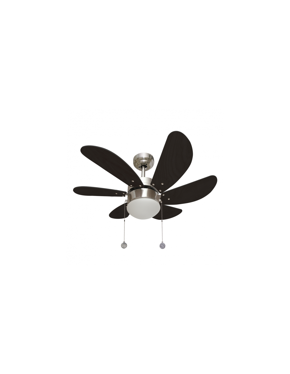 Ventilador DELFÍN realizado en metal, madera MDF y cristal color NIQUEL con seis aspas color WENGUÉ y tres velocidades. Su medida es de 41X85X85 centímetros. Mando a distancia OPCIONAL. Control de aire para verano o invierno. Portalámpara 1XE27. Bombilla no incluida. Modelo también disponible en Cuero-Cerezo, Níquel-Haya, Blanco, Colores pastel y en Colores intensos.