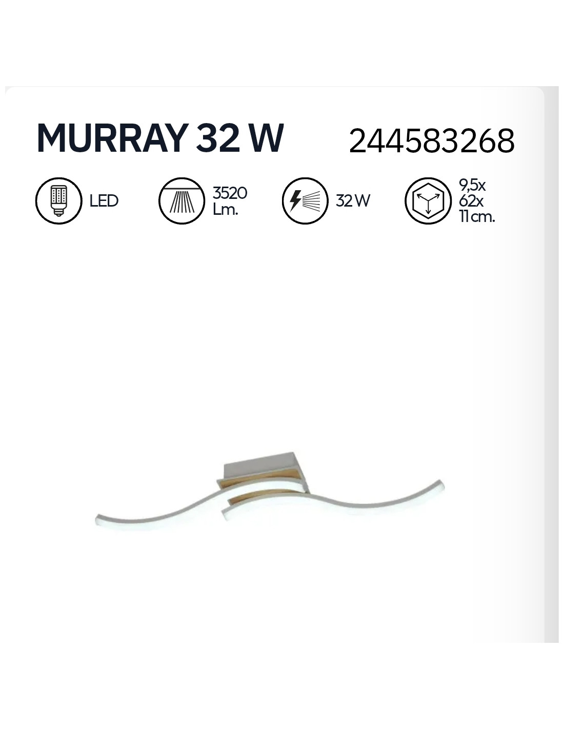 Plafón de la serie MURRAY en color BLANCO/HAYA. Realizado en metal, aluminio y acrílico. De diseño futurista muy moderno a la par que elegante, se aprecian dos ondas de luz sobre una pletina en madera. Ideal tanto para salas, salones y dormitorios como para cocinas y espacios de trabajo, dando sensación de profundidad, iluminan a la vez que decoran la estancia, el diseño de luces que presentan lo hacen el centro de la habitación que iluminan. Posee tecnología LED INTEGRADA, proporcionando un gran ahorro, con una potencia de 32 vatios y 3520 lúmenes, con TRES TEMPERATURAS SELECCIONABLES DE LUZ, 3000-4000-6500ºK (luz cálida, natural y blanco frío) pudiendo elegir en cada momento la que mejor se adapte a la actividad a realizar. Viene con MANDO A DISTANCIA incluido, REGULABLE EN INTENSIDAD y MEMORIA de color. Tiene unas dimensiones de 9,5x62x11 centímetros. Disponible en esta serie con tres diseños diferentes y todos en blanco/haya o en negro/madera, para elegir las combinaciones que mejor se adapten a su decoración.