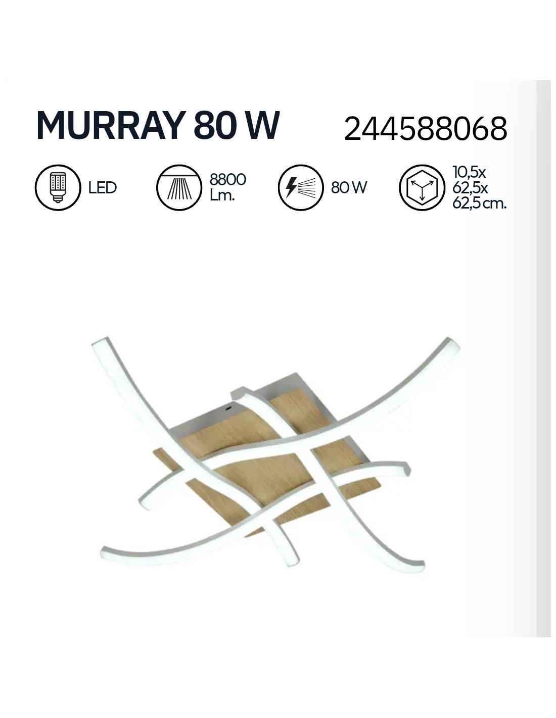 Plafón de la serie MURRAY en color BLANCO/HAYA. Realizado en metal, aluminio y acrílico. De diseño futurista muy moderno a la par que elegante, se aprecian cuatro ondas de luz entrelazadas sobre una pletina en madera, resultando un bonito juego lumínico. Ideal tanto para salas, salones y dormitorios como para cocinas y espacios de trabajo, dando sensación de profundidad, iluminan a la vez que decoran la estancia, el diseño de luces que presentan lo hacen el centro de la habitación que iluminan. Posee tecnología LED INTEGRADA, proporcionando un gran ahorro, con una potencia de 80 vatios y 8800 lúmenes, con TRES TEMPERATURAS SELECCIONABLES DE LUZ, 3000-4000-6500ºK (luz cálida, natural y blanco frío) pudiendo elegir en cada momento la que mejor se adapte a la actividad a realizar. Viene con MANDO A DISTANCIA incluido, REGULABLE EN INTENSIDAD y MEMORIA de color. Tiene unas dimensiones de 10,5x62,5x62,5 centímetros. Disponible en esta serie con tres diseños diferentes y todos en blanco/haya o en negro/madera, para elegir las combinaciones que mejor se adapten a su decoración.