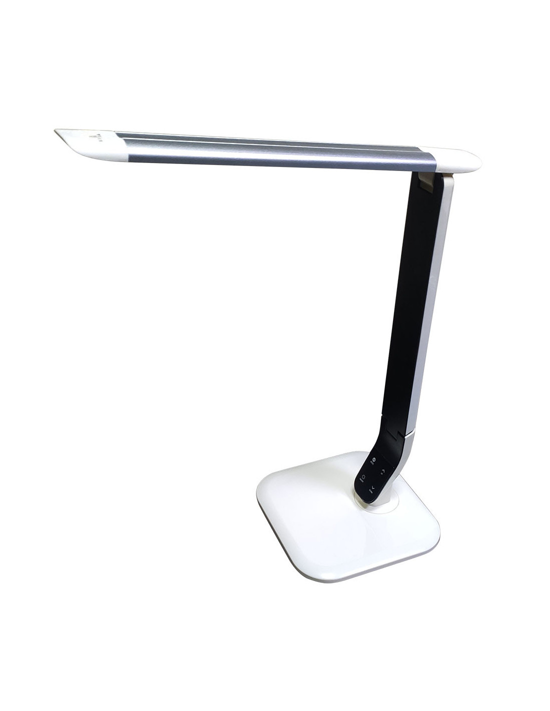 Flexo Led de la serie EUCLASA en color BLANCO/PLATA. Realizado en ABS, de diseño moderno y elegante con líneas sencillas, ideal para cualquier tipo de mesa de estudio, lectura o de trabajo. De encendido y apagado táctil, tiene una potencia de 10 watios, 800 lúmenes y tres colores de luz, 3000,4000 y 6000k (luz cálida, blanca natural o blanca fría). Con regulador de intensidad de la luz para lograr la intensidad deseada acorde con la actividad a realizar, tipo de lámpara muy aconsejable para el descanso ocular. Articulado y con cabezal giratorio para conseguir el ángulo idóneo de iluminación, plegable, abatible y ligero, lo que lo hace también muy útil para transportar. Tiene una dimensión de 57x34x18 centímetros. Modelo también disponible en color negro/blanco.