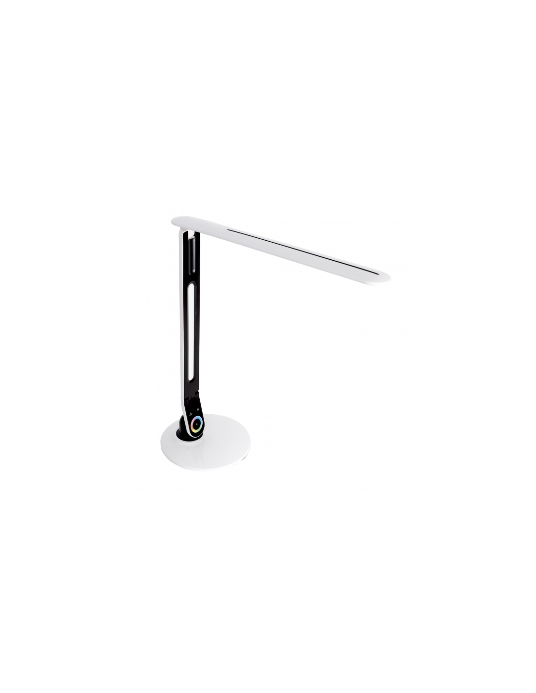 Moderno flexo serie HOBA en color blanco con tecnología LED INTEGRADA. Sus medidas son de 47<,80X19X19 centímetros y tiene un peso neto de 1125 gramos. Su potencia de luz es de 7,8 watios, 1200 lúmenes y 5000K, con tres intensidades, RGB para luz de noche, quitamiedos, pudiéndose elegir el color. Viene con un útil Puerto USB y ahorro de energía.