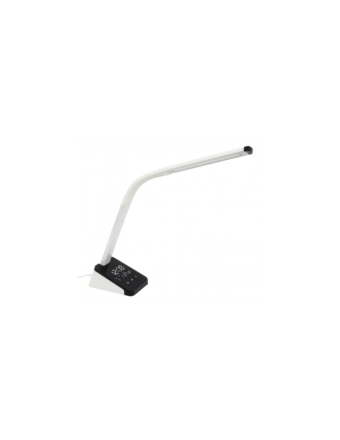 Moderno flexo serie CHACO en color BLANCO/NEGRO. Realizado en ABS, silicona y metal, flexible y orientable, pudiéndose dirigir su luz dónde desee, de tacto suave y muy agradable. Con tecnología LED INTEGRADO. Tiene una potencia de 10 watios, 1350 lúmenes y tres colores regulables de luz, 3000-4000-6500K (luz cálida, blanco neutro y blanco frío). Con un diseño muy moderno y versátil, fácil de transportar, viene con un útil PUERTO USB y funciones de RELOJ,ALARMA,TEMPERATURA Y CALENDARIO, pudiéndose utilizar tanto en dormitorios como en zonas de trabajo. Sus medidas son de 70,2x12x17,5 centímetros, y tiene un peso neto de 1255 gramos.