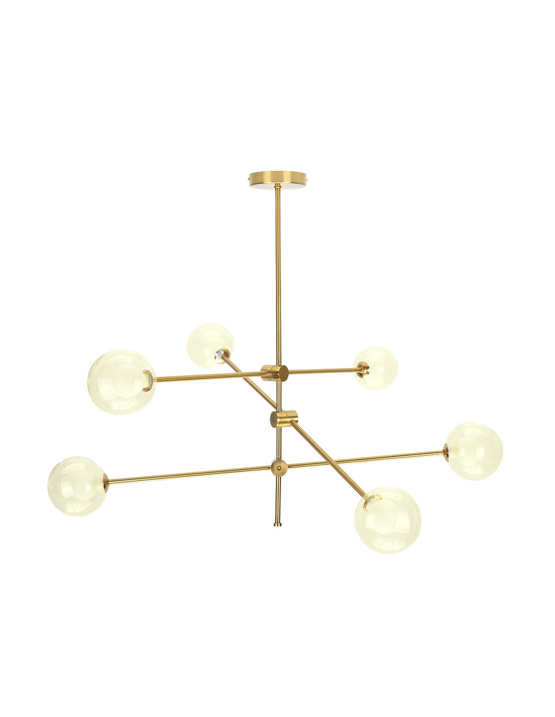 Lámpara de seis luces de la serie JERUSALEN de color BRONCE con dobles tulipas, blancas y transparentes. Está compuesta por un cuerpo central de metal en el cuál convergen de forma horizontal tres partes rígidas, pudiéndose orientar la proyección de la luz en su plano vertical y la disposición de sus tulipas. Sus dobles tulipas, una transparente y otra de color blanco en su interior, proyectan una luz cálida y difusa en general, resultando una composición muy original y bonita de estilo moderno. Sus dimensiones son de 72x90x90 centímetros. Posee seis porta lámparas G9. Bombillas no incluidas. Aconsejable usar G9 de 4W, como las de las referencias 148003041,148030042 ó 148003043. Ideal para decorar e iluminar cualquier estancia de la casa o lugar de trabajo, dando un toque sofisticado y elegante, acorde tanto con estilo moderno como clásico o rústico. Está disponible también en la versión de la misma serie, lámpara de cuatro luces, sobremesa y el pie de salón con tres luces. En esta misma serie, también podemos encontrar la lámpara de seos luces y la de cuatro luces, con una sola tulipa transparente y con portalámparas E27, por si prefieren acompañar con bombillas vintage.