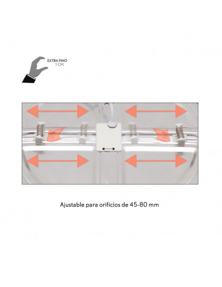 Downlight serie PROVIDENCIA de LED integrado en color cromo. Su instalación es encastrada. Se caracteriza por ser extremadamente fino (1 cm) por lo que es ideal para espacios muy reducidos. La potencia es de 8 W y sus lúmenes 586. El color de la luz es de 5500ºk (blanco neutro) y su ángulo de apertura es de 120 º.  La medida de corte cuadrado oscila entre 4,5-8 ya que presenta la peculiaridad de que se puede ajustar al hueco.