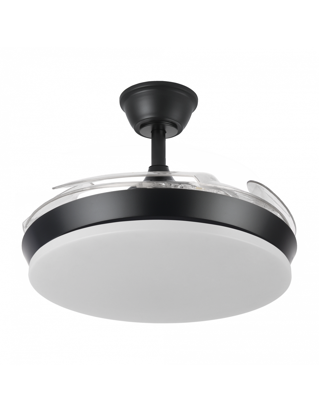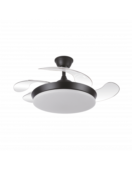 Ventilador DC de la serie TRIDENTE MINI realizado en metal, policarbonato y ABS, en color NEGRO con cuatro aspas DESPLEGABLES de ABS transparente muy resistentes. De diseño innovador, ideal para completar tanto en decoraciones modernas como clásicas, realizando tanto la función de lámpara como de ventilador. Motor DC con seis velocidades ajustables. Tecnología LED integrada con una potencia de 59W, 6980 lúmenes y 3 TEMPERATURAS SELECCIONABLES DE LUZ (3000-4000-6000K) luz cálida, natural y blanco frío. Es REGULABLE EN INTENSIDAD, con mando a distancia INCLUIDO con MEMORIA DE COLOR incorporada y TEMPORIZADOR 2/4 H. Control de aire verano o invierno. Su medida es de 34,5/42X40 centímetros con las aspas plegadas y de 34,5/42X91 centímetros con las aspas desplegadas. Incluye dos tijas de 12,5 y 20 centímetros, para colocar a distintas alturas. Encontramos en esta serie dos tamaños de ventiladores y en los colores blanco, negro, níquel y cuero, para elegir el más le guste y el que mejor se adapte a su decoración.
