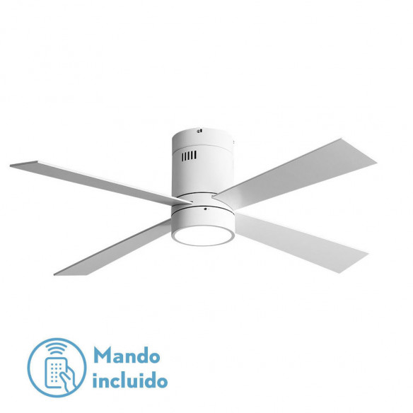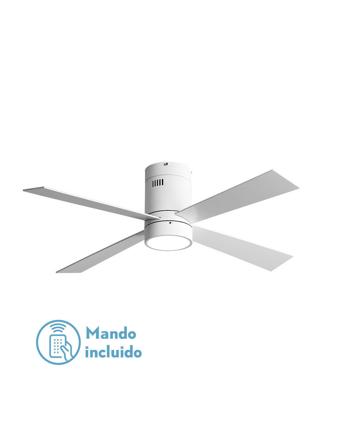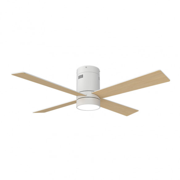 Ventilador BARINE realizado en metal, madera y policarbonato, en color BLANCO con cuatro aspas REVERSIBLES de color BLANCO/HAYA. Tiene tres velocidades ajustables. Tecnología LED incorporada con una potencia de 18W, con 3 TEMPERATURAS DE LUZ( 3000-4000-6000K) y 2350 lúmenes. Su medida es de 30X122X122 centímetros. Control de aire sólo verano. Mando a distancia INCLUIDO con MEMORIA DE COLOR incorporada y TEMPORIZADOR 1/2/4/8 H. Modelo también disponible en Marrón-Haya/Marrón, Cuero-Roble/Cerezo y Níquel-Haya/Plata.