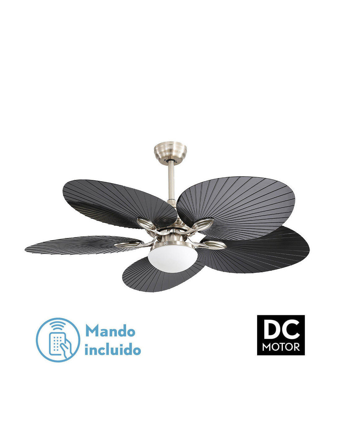 Ventilador DC serie CHAW realizado en metal, ABS y cristal, en color NÍQUEL con cinco aspas de diseño HOJA DE PALMA TROPICAL de color NEGRO. Tiene seis velocidades ajustables. Tecnología LED incorporada con una potencia de 24W, con 3 TEMPERATURAS DE LUZ( 3000-4000-6000K) y 2950 lúmenes. Su medida es de 36/48,5,5X132X132 centímetros, viene con DOS MEDIDAS DE TIJA, lo que permite adaptarlo a distintas alturas de techo. Control de aire verano o invierno. Mando a distancia INCLUIDO con MEMORIA DE COLOR incorporada y TEMPORIZADOR 1/2/4/8 H. Modelo también disponible en negro/marrón.