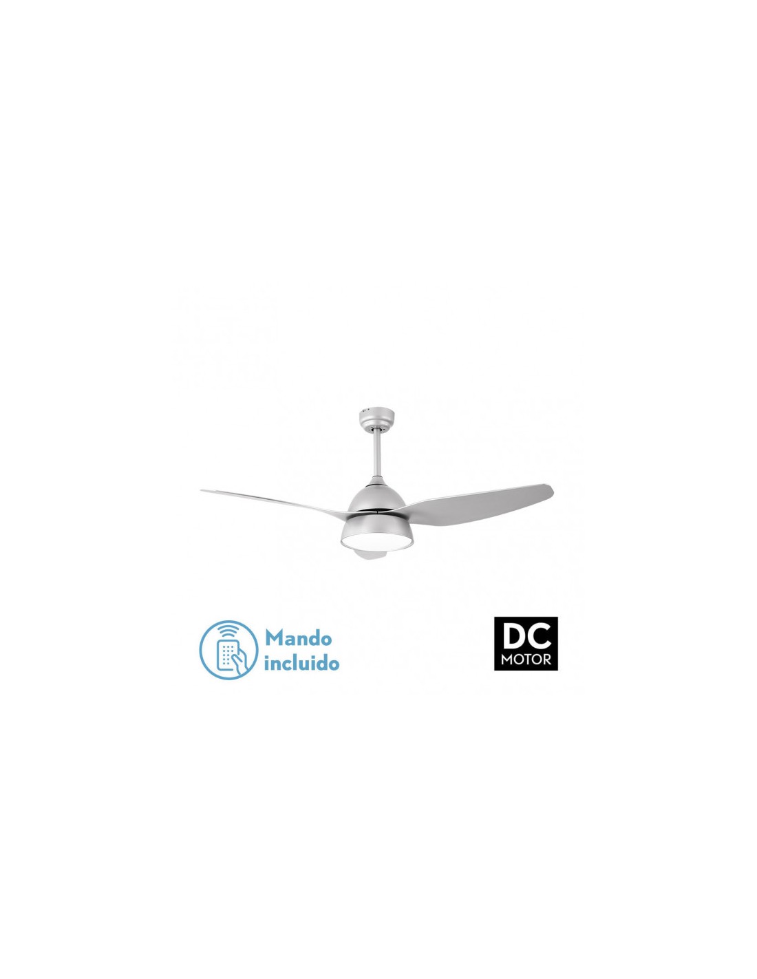 Ventilador KOHILO realizado en metal, policarbonato y ABS, en color PLATA con TRES aspas. Motor DC. Tiene seis velocidades ajustables. Posee dos portalámpara E27. Bombillas no incluidas. Su medida es de 41/53,5x132x132 centímetros, con dos medidas de Tijas para diferentes alturas de techo. Control de aire verano o invierno. Mando a distancia INCLUIDO y TEMPORIZADOR. Modelo también disponible en Blanco, Marrón y Cuero/Negro.