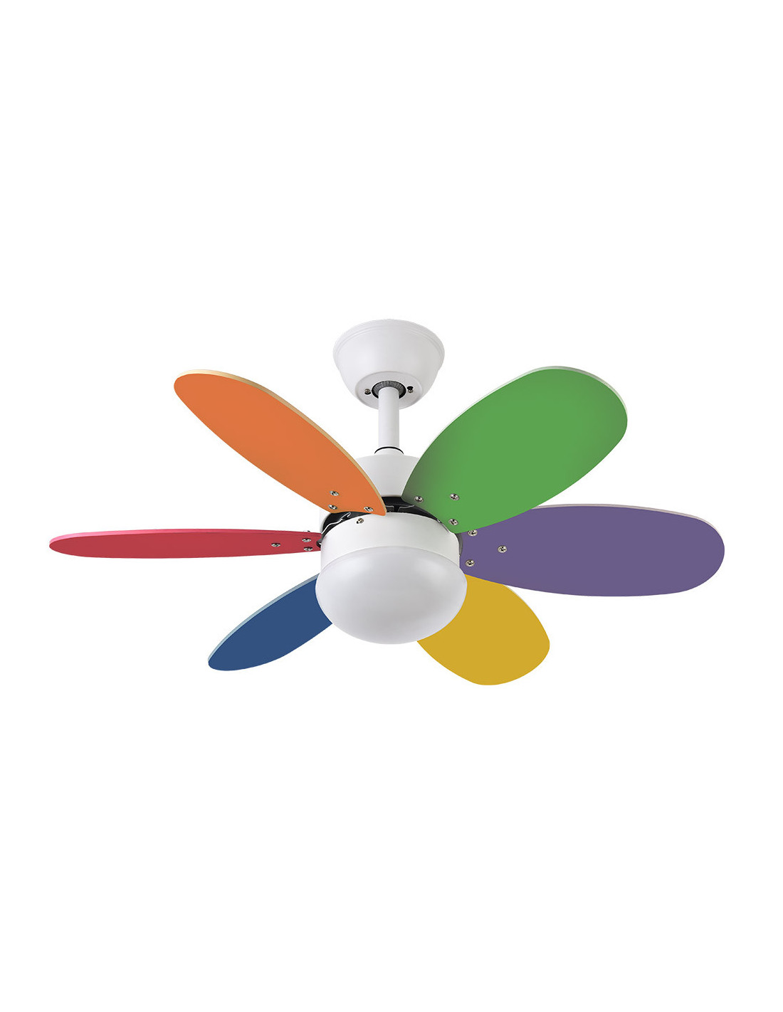 Ventilador DC serie ALVES de color BLANCO con cinco aspas REVERSIBLES en color PASTEL/INTENSO y seis velocidades. Sus dimensiones son 41x85x85 centímetros. Posee 2 portalámparas E27. Bombillas no incluidas. Tiene control remoto INCLUIDO con la opción verano/invierno y la opción de temporizador de 1 hasta 4 horas. El cuerpo del ventilador es de metal y policarbonato, y las aspas de MDF. Disponible también en color Níquel-Plata/Haya, Cuero-Cerezo/Nogal, Níquel-Wengué/Haya y Blanco-Blanco/Haya.