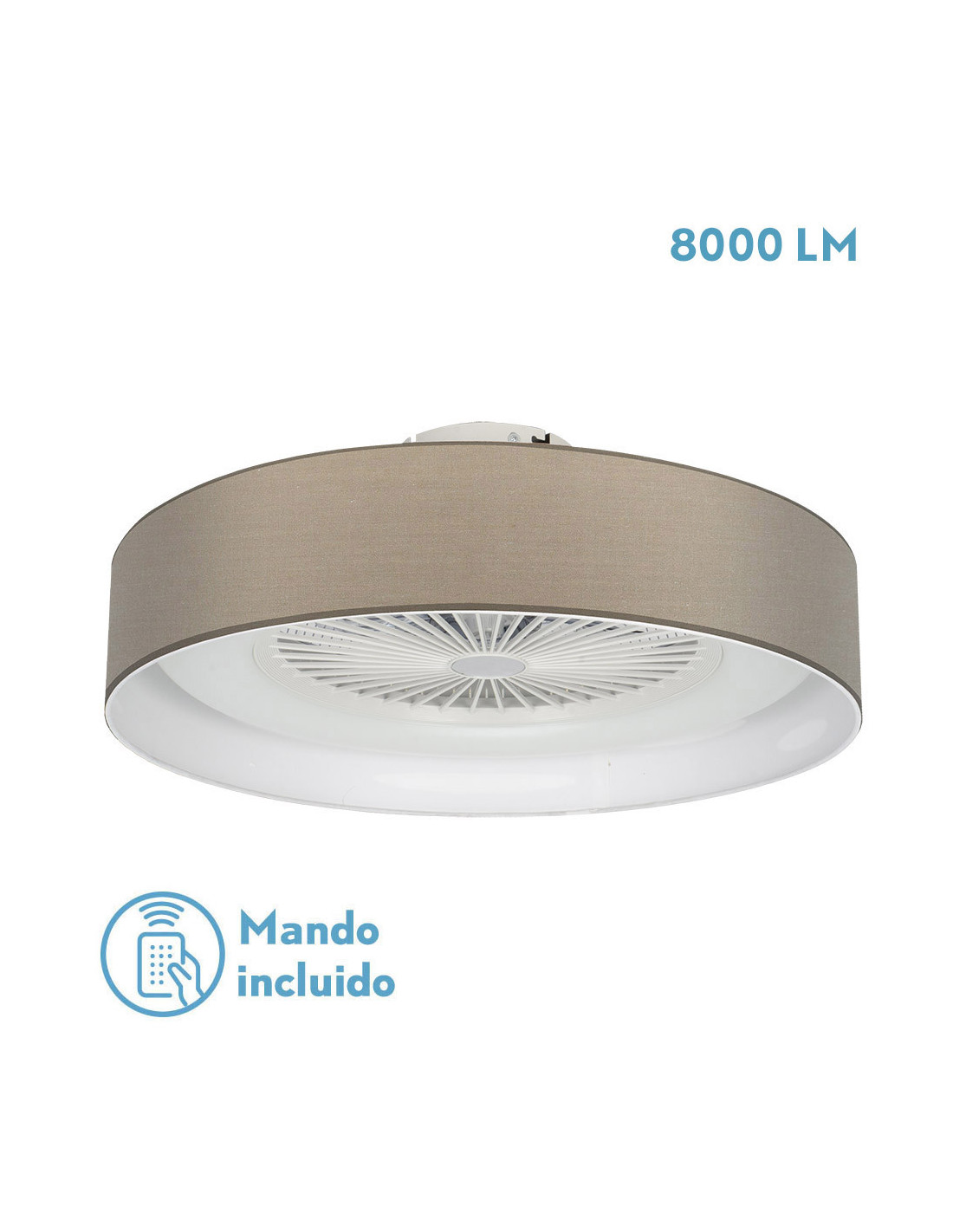 Ventilador serie IBOR de color BLANCO. Con ventilador de la serie PERI. Realizado en metal, policarbonato y una pantalla de textil de color PIEDRA. Diseño moderno, con 5 aspas integradas en su estructura y 3 velocidades ajustables. Posee TECNOLOGÍA LED INTEGRADA con 72 watios de potencia, 8000 lúmenes, 3 temperaturas de luz Y REGULABLE EN INTENSIDAD, cálida, natural y luz blanco frío (3000ºk-4000ºk-6000ºk). Sus dimensiones son de 23x57,5x57,5 centímetros. Incluye MANDO A DISTANCIA, CON MEMORIA DE COLOR y TEMPORIZADOR 1/2 H. Muy decorativo y original, pudiéndose también combinar en dormitorios con el sobremesa a juego de esta misma serie. Modelo también disponible en color blanco/azul, blanco/lila y blanco/rosa.