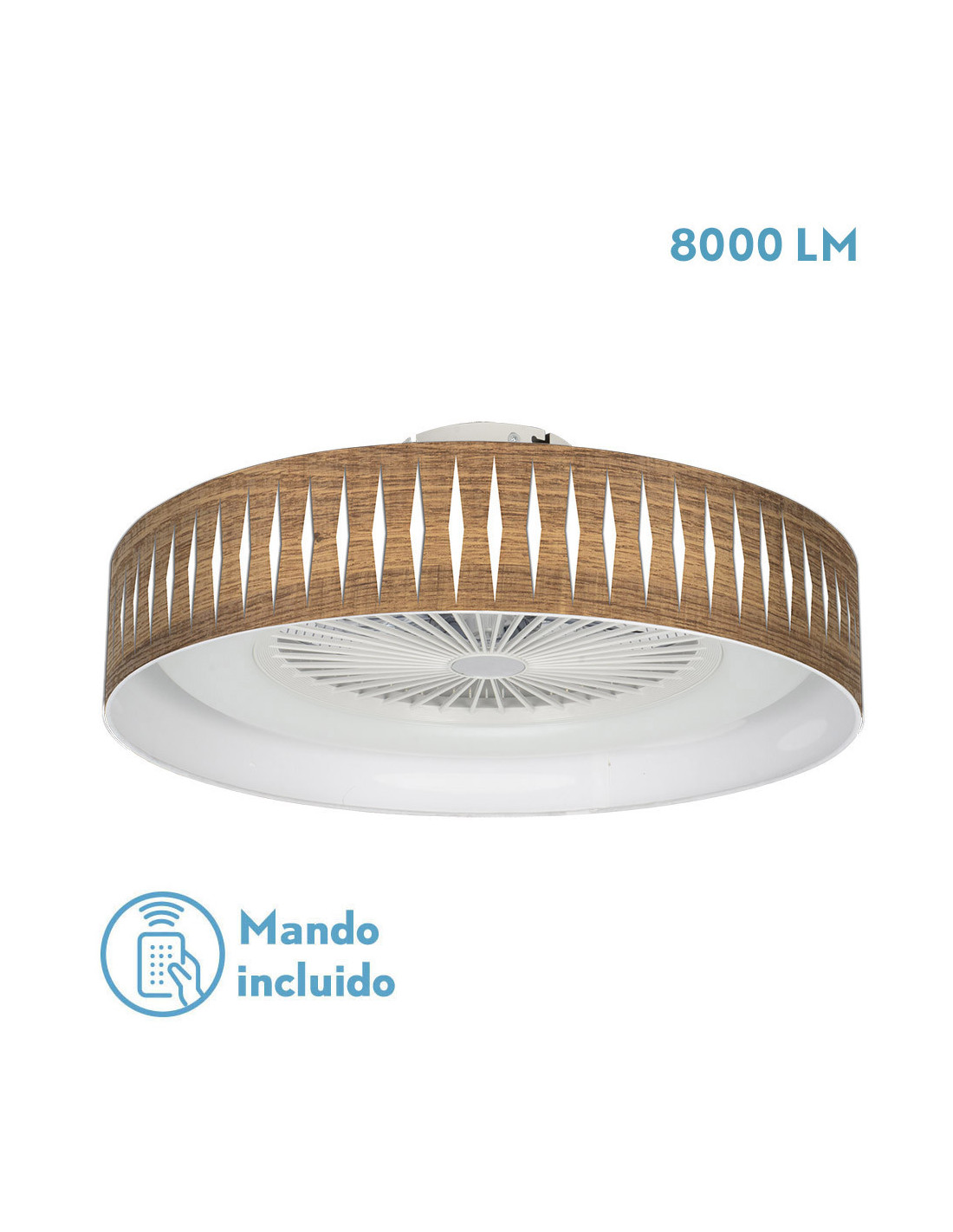 Ventilador serie PIRON de color BLANCO. Con ventilador de la serie PERI. Realizado en metal, policarbonato y una pantalla de textil de color MADERA OSCURA. Diseño moderno, con 5 aspas integradas en su estructura y 3 velocidades ajustables. Posee TECNOLOGÍA LED INTEGRADA con 72 watios de potencia, 8000 lúmenes, 3 temperaturas de luz y REGULABLE EN INTENSIDAD, cálida, natural y blanco frío (3000ºk-4000ºk-6000ºk). Sus dimensiones son de 23x57,5x57,5 centímetros. Incluye MANDO A DISTANCIA, CON MEMORIA DE COLOR y TEMPORIZADOR 1/2 H. Muy decorativo y original, pudiéndose también combinar en dormitorios y salones con el sobremesa y el Pie de salón a juego de esta misma serie. Modelo también disponible en color blanco/madera negra, blanco/óxido, blanco/madera gris, blanco/madera clara y blanco/cemento gris.