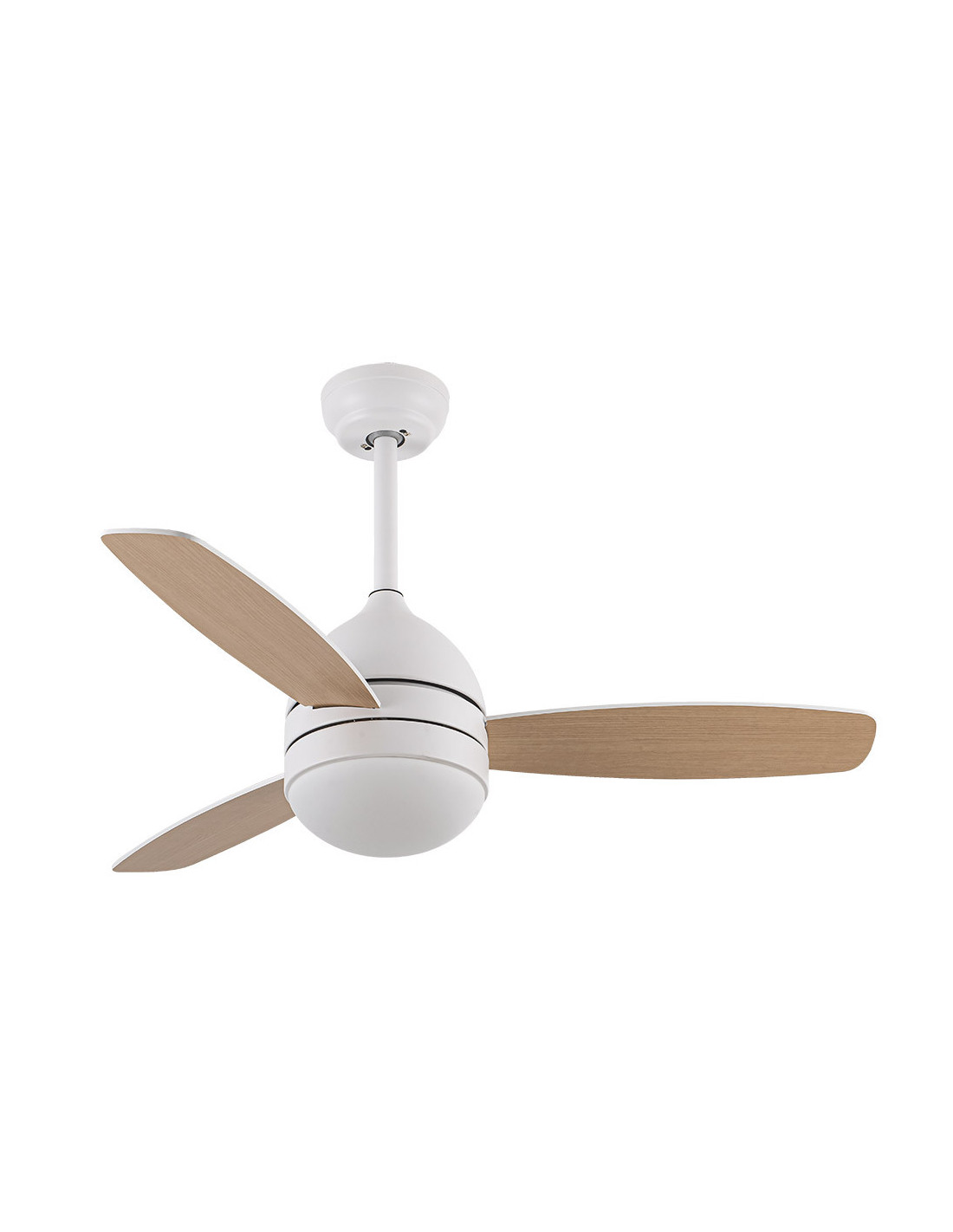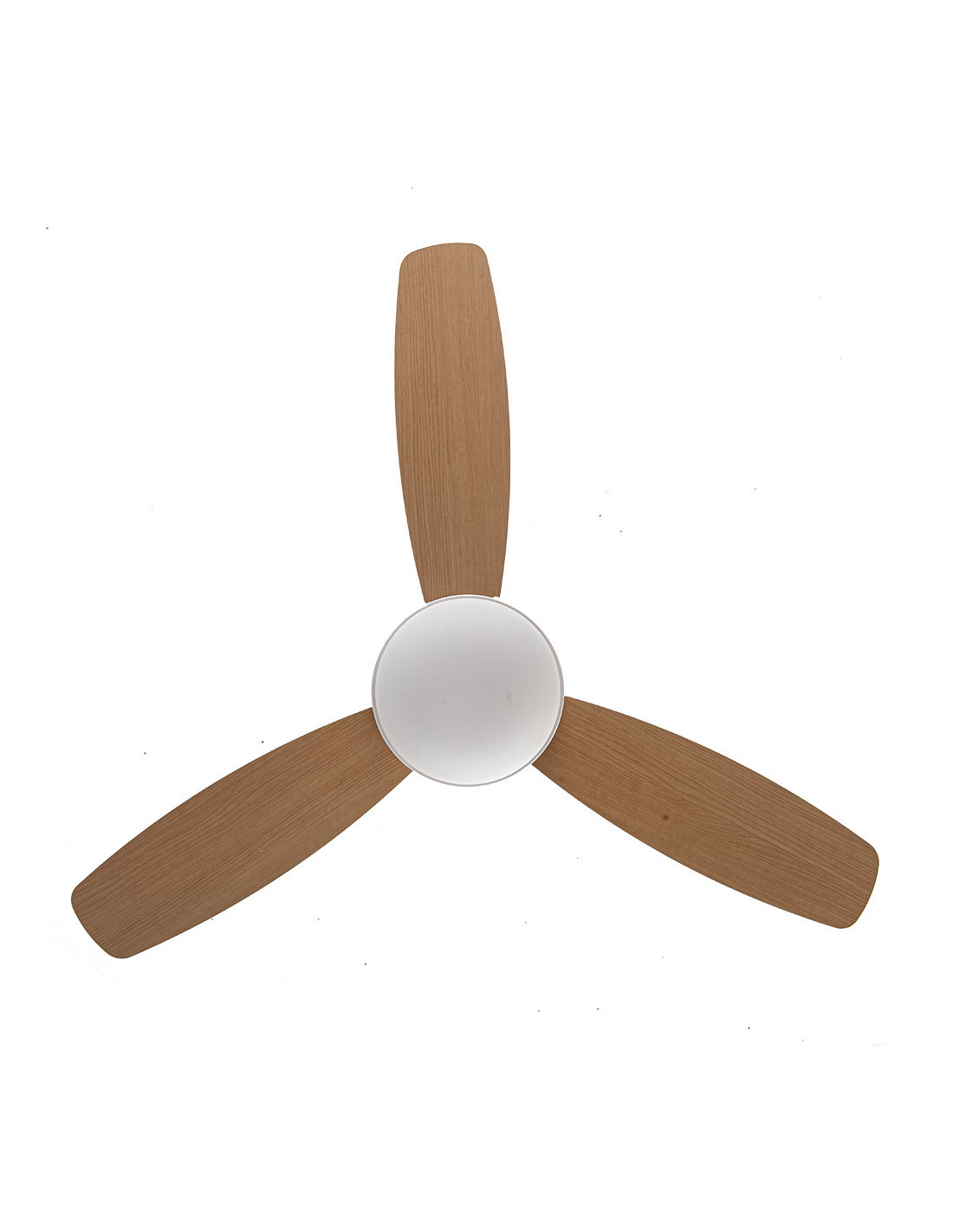Ventilador DC de la serie MAESTRAL de color BLANCO con 3 aspas reversibles color BLANCO/HAYA. Realizado de metal, ABS y tulipa de cristal. Tiene una medida de 47/57,2x106,7x106,7 centímetros. Tecnología LED integrada con una potencia de 30W, con COLOR DE LUZ SELECCIONABLE EN 3 TEMPERATURAS (3000-4000-6000K) y 2850 lúmenes. Contiene control remoto con 6 velocidades diferentes, memoria de color, modo de verano/invierno y temporizador de 1 hasta 8 horas. Incluye dos tijas de 15 y 25 centímetros. Modelo disponible en los colores blanco-blanco/haya, cuero-roble/nogal y níquel-plata/haya, hasta agotar existencias.