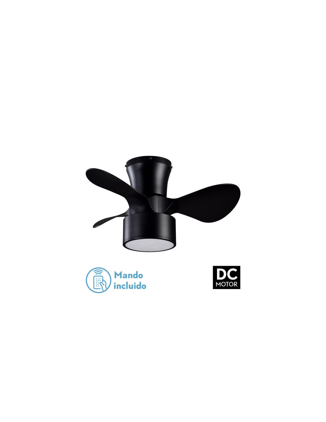 Ventilador DC serie KOS realizado en metal, ABS y policarbonato, en color NEGRO con tres aspas. Motor DC. Tiene seis velocidades ajustables. Tecnología LED INTEGRADA con una potencia de 24W, con 3 TEMPERATURAS DE LUZ (3000-4500-6000K), luz cálida, blanco natural y blanco frío, y 2390 lúmenes. De diseño moderno y muy original por su estructura compacta, ideal para pequeñas estancias y habitaciones juveniles. Su medida es de 28x60x60 centímetros. Control de aire verano o invierno. MANDO A DISTANCIA INCLUIDO con MEMORIA DE COLOR incorporada y TEMPORIZADOR 1/2/4/8 H. Modelo también disponible en blanco/haya y en blanco.