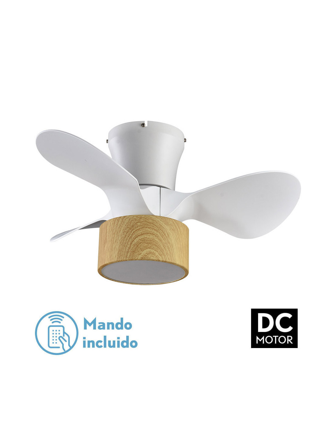 Ventilador DC serie KOS realizado en metal, ABS y policarbonato, en color BLANCO/HAYA con tres aspas. Motor DC. Tiene seis velocidades ajustables. Tecnología LED INTEGRADA con una potencia de 24W, con 3 TEMPERATURAS DE LUZ (3000-4500-6000K), luz cálida, blanco natural y blanco frío, y 2390 lúmenes. De diseño moderno y muy original por su estructura compacta, ideal para pequeñas estancias y habitaciones juveniles. Su medida es de 28x60x60 centímetros. Control de aire verano o invierno. MANDO A DISTANCIA INCLUIDO con MEMORIA DE COLOR incorporada y TEMPORIZADOR 1/2/4/8 H. Modelo también disponible en negro y en blanco.