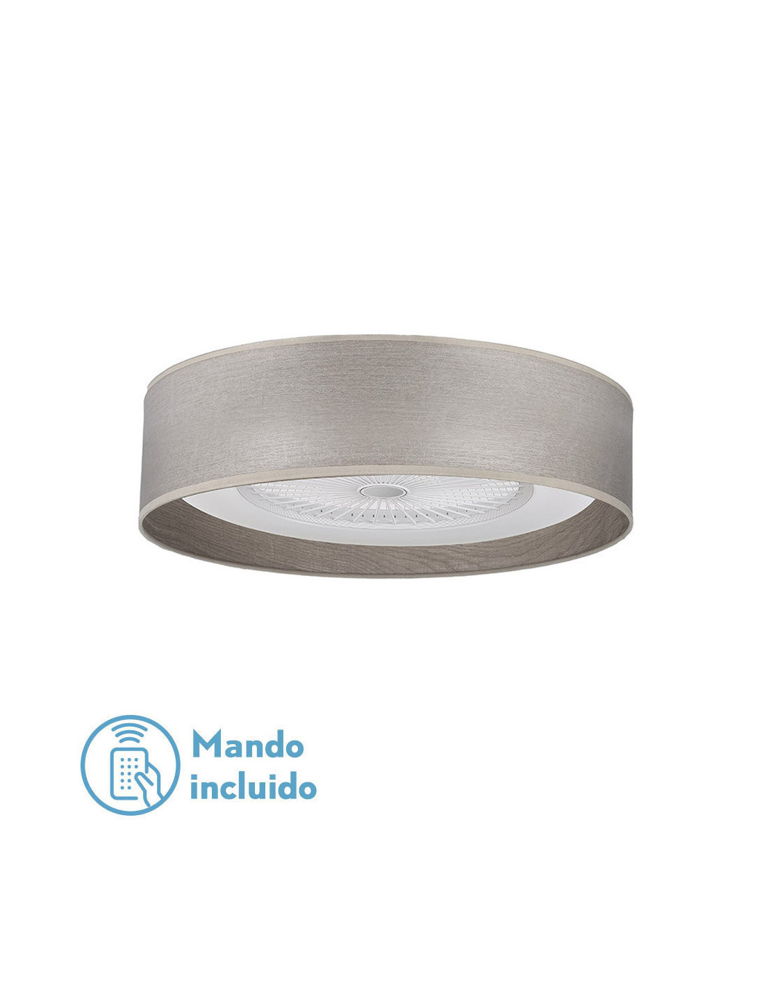 Ventilador de la serie TANIA de color MADERA GRIS en el interior de su pantalla. Con ventilador de la serie PERI. Original producto que decora y refresca la habitación que ilumina con 5 aspas integradas en su estructura y 3 velocidades ajustables. Posee TECNOLOGÍA LED INTEGRADA con 72 watios de potencia, 8000 lúmenes y TRES TEMPERATURAS DE LUZ, cálida, natural y blanco frío (3000ºk-4000ºk-6000ºk) con REGULADOR DE INTENSIDAD. Además de aportar un gran ahorro de energía, incluye MANDO A DISTANCIA, CON MEMORIA DE COLOR y TEMPORIZADOR 1/2 H. Destaca su original pantalla cilíndrica que combina el blanco y el negro con colores madera siempre en el interior, resultando una combinación muy moderna y elegante, ideal para dormitorios, despachos, salones y salas de estar. Muy acorde tanto para decoraciones rústicas como modernas o vintage. Tiene unas dimensiones de 25x60x60 centímetros. En esta serie podemos encontrar dos ventiladores diferentes, los colgantes de 50, 40 y 30 centímetros de diámetro, dos tamaños diferentes de sobremesas, aplique, plafones de 48, 72 y 96 watios y el pie de salón, todos combinando con colores madera.