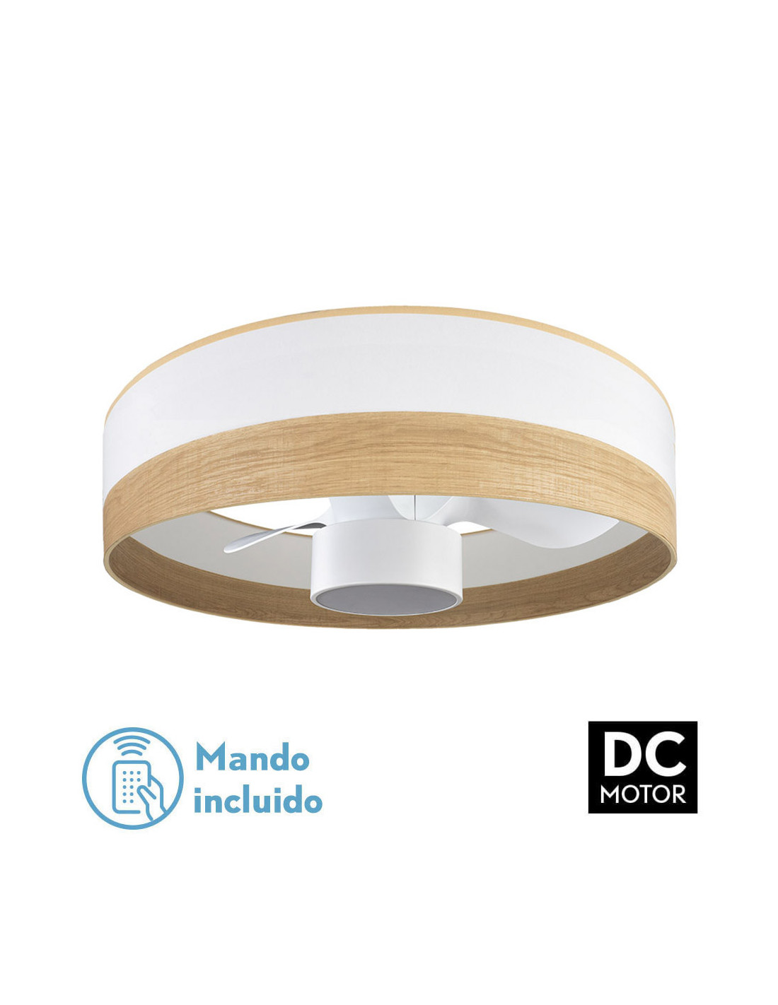 Ventilador DC de la serie OLGA con pantalla confeccionada en colores BLANCO/MADERA CLARA y ventilador BLANCO de la serie KOS. Realizado en metal, textil y policarbonato, con tres aspas de ABS. Motor DC. Tiene seis velocidades ajustables. Tecnología LED INTEGRADA con una potencia de 24W, con 3 TEMPERATURAS DE LUZ (3000-4500-6000K), luz cálida, blanco natural y blanco frío, y 2390 lúmenes. El original diseño de sus pantallas, combinando el blanco con colores madera clara o madera negra, hace que esta serie pueda combinarse con distintos estilos de decoración, desde el moderno al rústico, muy acorde también con decoraciones naturales o minimalistas. Aportan calidez a comedores, dormitorios, salones y centros de trabajo. Tiene unas dimensiones de 30x70x70 centímetros. Control de aire verano o invierno. MANDO A DISTANCIA INCLUIDO con MEMORIA DE COLOR incorporada y TEMPORIZADOR 1/2/4/8 H. Modelo también disponible con ventilador en negro y en blanco. Se puede completar con toda una serie de artículos a juego, como colgantes, plafones, sobremesas, apliques y pies de salón, para cubrir todas las necesidades de iluminación que requiera su hogar o centro de trabajo.